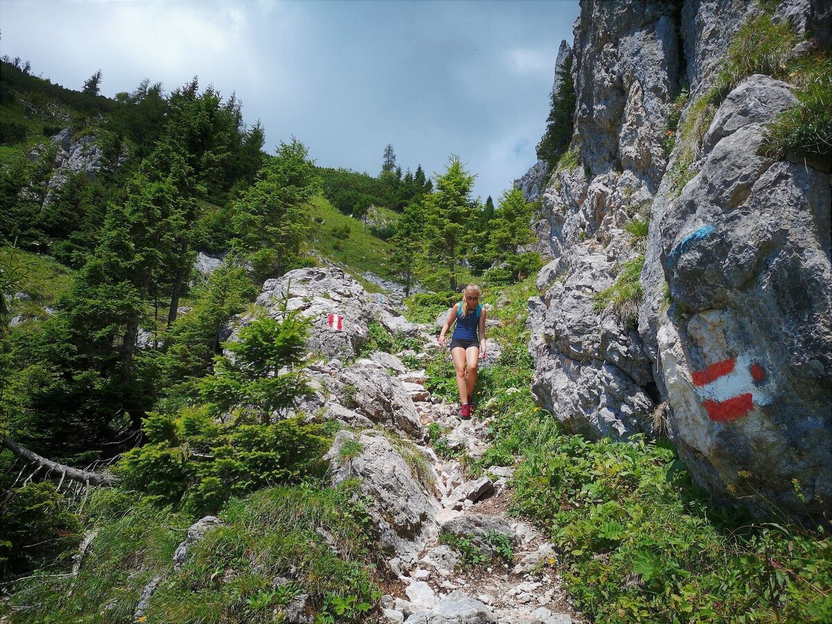 From Neuberg an der Mürz, the trail leads through the Farfel in almost a direct line to the Schneealm Plateau. As a result, some sections of the trail are quite steep, and in the upper part, there are rocky stretches to navigate—though there is no significant risk of falling.