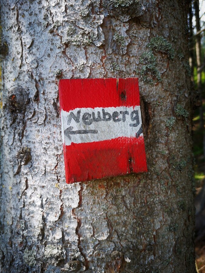 In the town center of Neuberg an der Mürz, we start at the Spar Markt and hike upwards through the district of Neudörfl until we reach a forest path. This path soon turns to the right, leading to a prominent trail junction (Spielkogel, 1,020 m). From here, we turn left and continue uphill on the increasingly steep forest path, winding through numerous switchbacks until we reach the base of the Farfel.