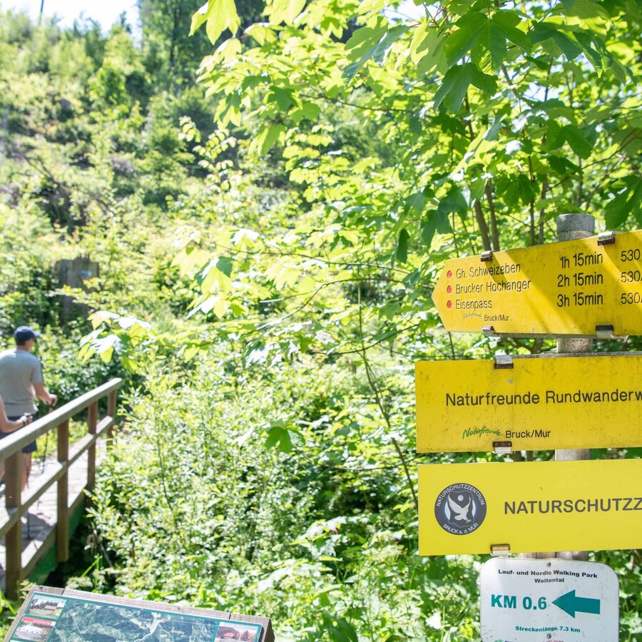 The wide forest path is followed even further to reach the spring catchment of the "Kalten Quelle" after another 30 minutes. This spring once served as a water supply for the town of Bruck and today serves to quench the thirst of all passing hikers.