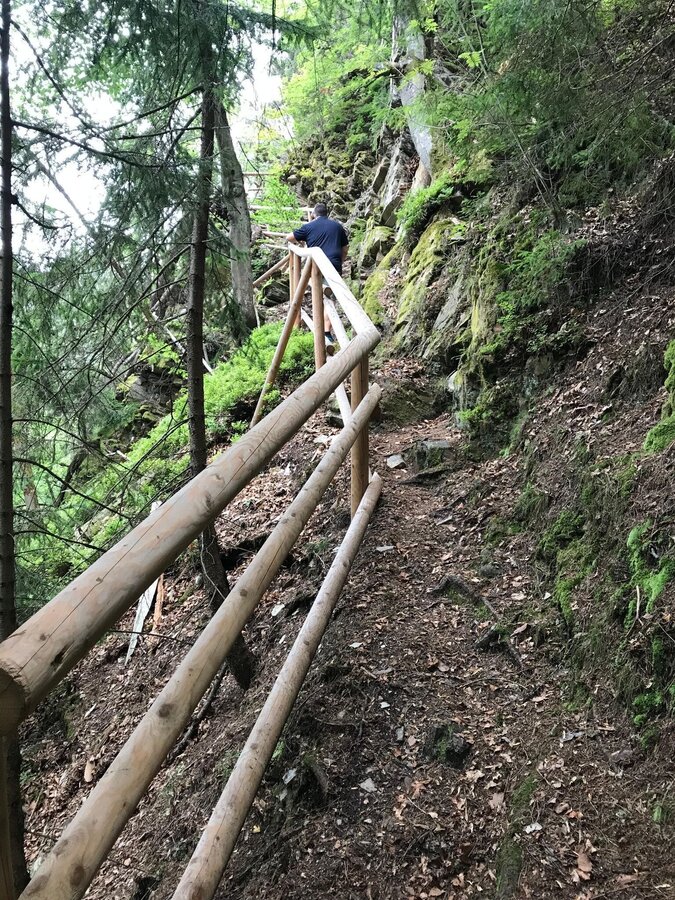 From here the path narrows somewhat and after a few minutes the trail turns to the right upwards in the direction of Rabenwand.The gradient now increases noticeably and also the path itself has now changed to a narrow climb. Some hairpin bends lead through partly quite dense forest to a rock formation. This is overcome over several wooden ladders spectacularly, but safely (wide railing), whereby in the upper part an impressive deep view of the Weitental is offered.