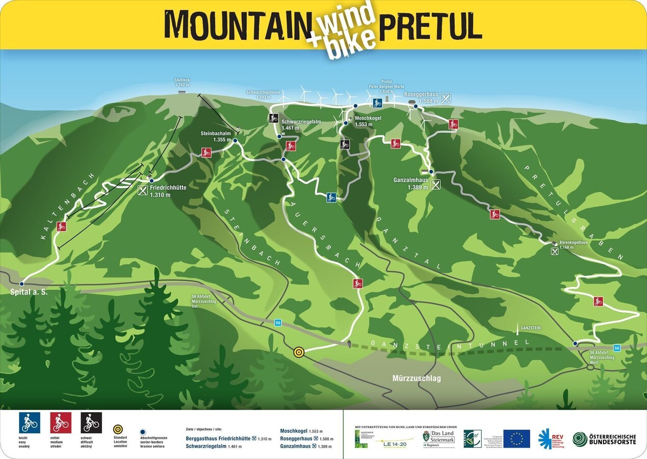 In 2017, the wind park on Pretul was inaugurated. In collaboration with the Austrian Federal Forests, the Wind+Bike Park Pretul mountain bike trails were opened. These trails can be ridden either as a circular route or as individual tours.