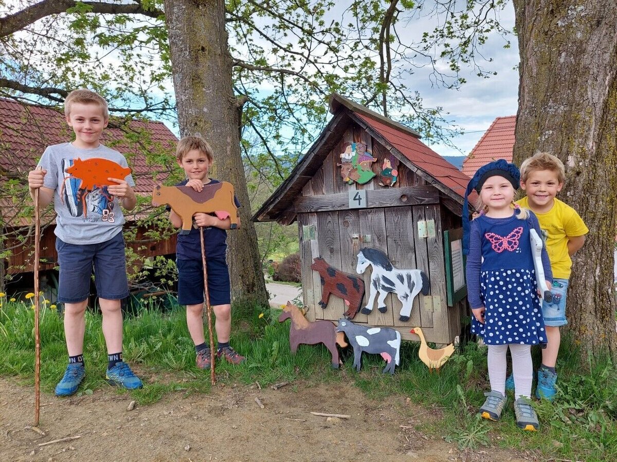 You walk the bathing lake circuit to the wooden house. There you follow the path towards Aich (Dorf-Peat-Trail sign). Turn left on the asphalt road and follow the road into the village of Aich. At the Khom riding farm you join the Hans-im-Glück hiking trail, which runs parallel to the main road. Past the Hans-im-Glück stations and the robbers, you can already see the town of Mühlen with Jakobsberg. Under the underpass, past the Steinwidder family farm, then turn left up towards St. Helen. At the Rauchwald inn you can now see an old wayside shrine from the 16th century, the “Rauchenwald Cross”. It is very well preserved and a rarity in Austria. There you follow the road straight ahead, past the Bushütterl towards the swimming lake.