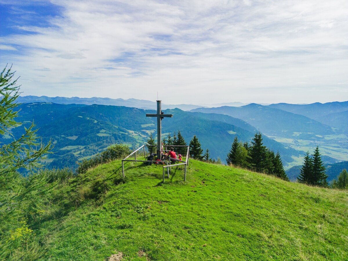 After the first steep but shady climb to Hinterburg, a sunny section of the trail leads us back into the forest, where there are several more steep climbs until we reach the ridge. We follow this ridge, passing ancient trees, until we finally come to a clearing at the tree line. After a short climb across a mountain meadow, we reach the summit cross of the “Pleschaitz” (Slavic, translated: “bald head”). Here we are rewarded with a magnificent view in both directions of the Mur Valley.