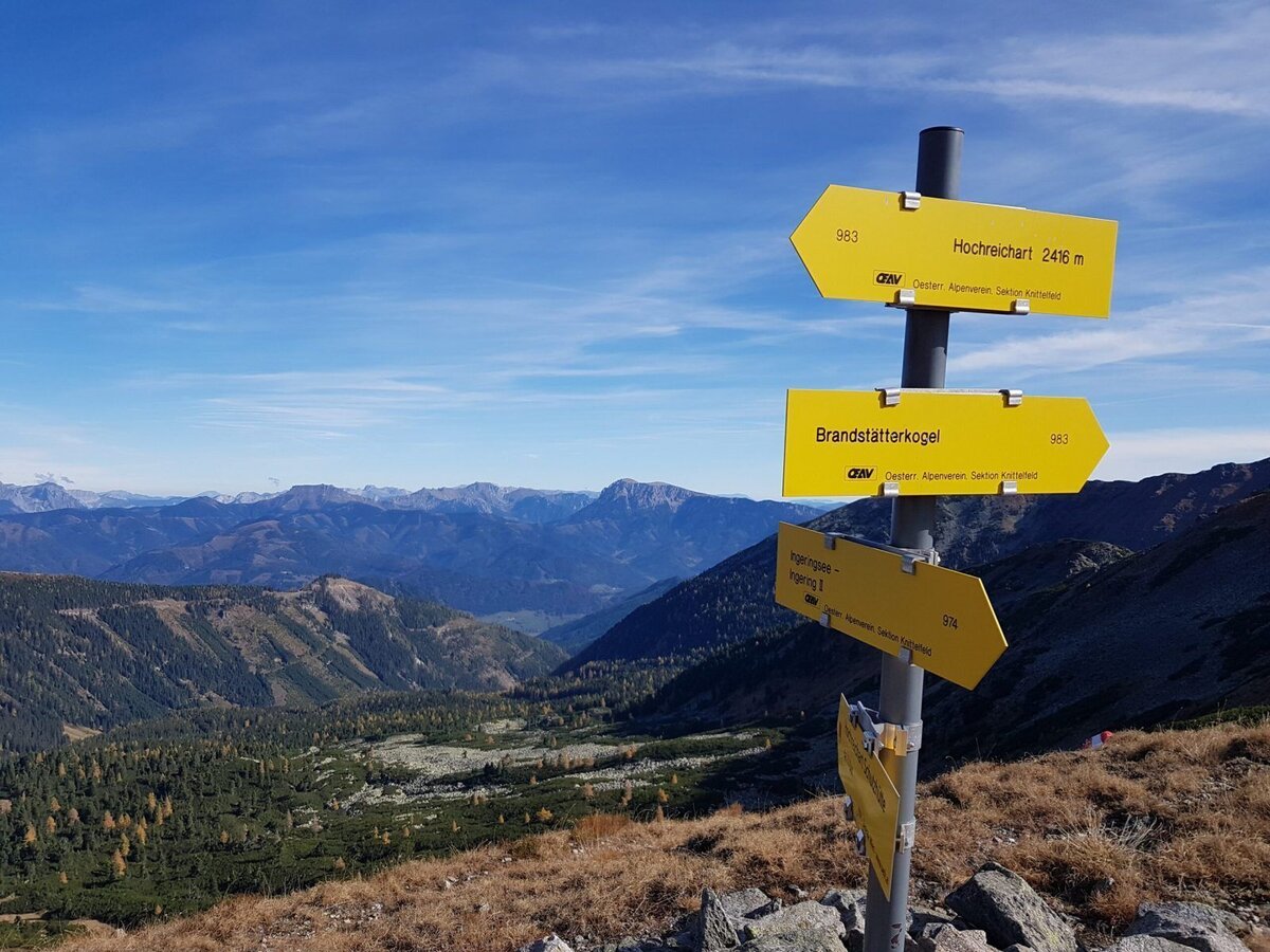 Am Brandstättertörl angekommen, genießt man die Aussicht bereits auf den Hochreichart und den Eisenerzer Alpen.