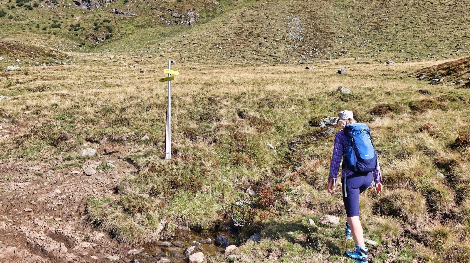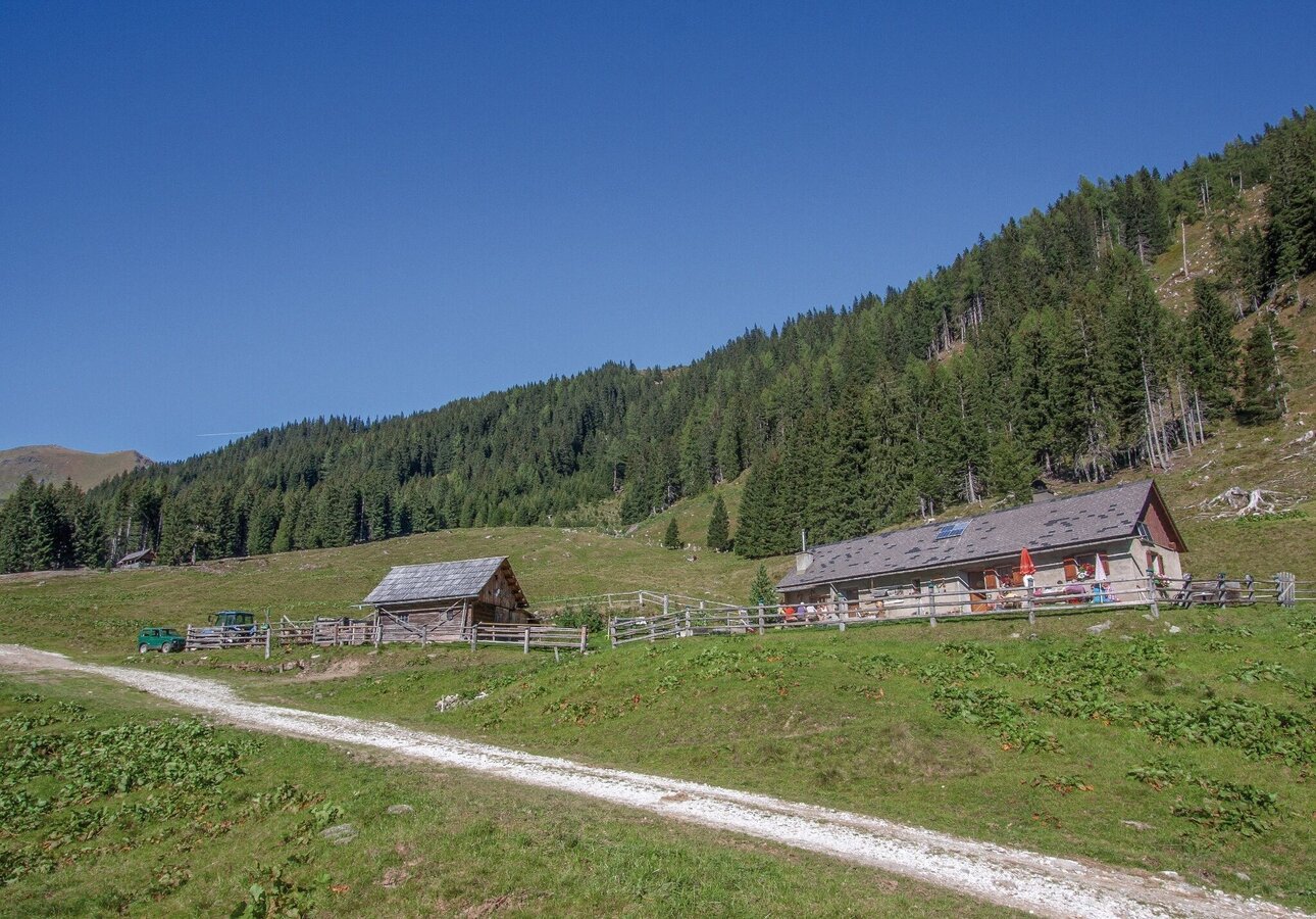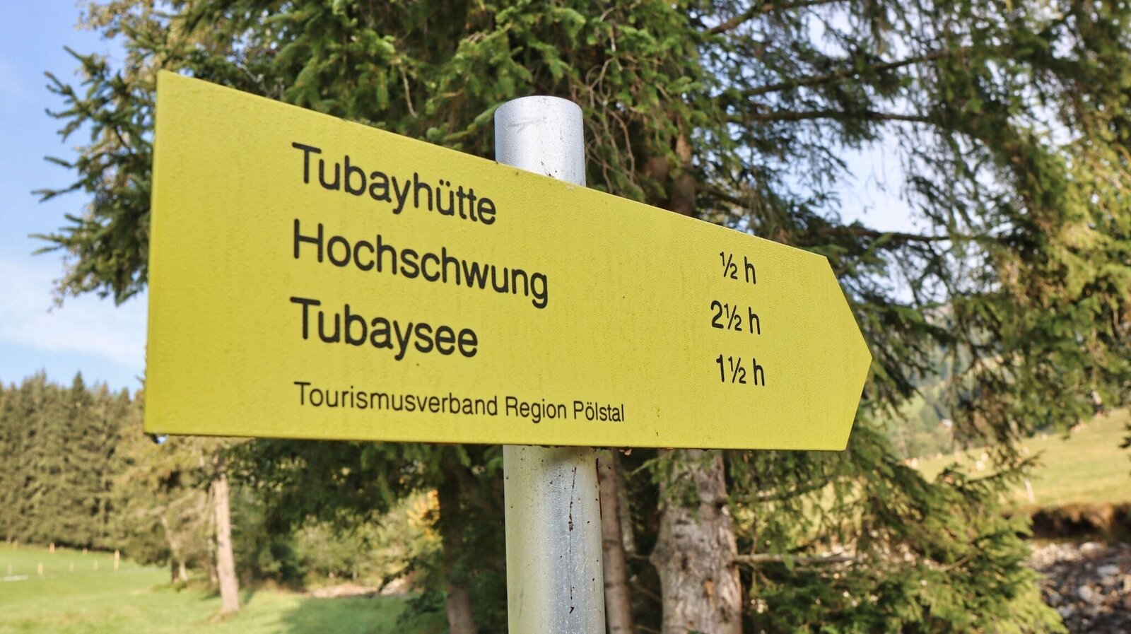 We start at the parking lot Tubay (1), 1196 m, in the Bretsteingraben, cross the bridge over the Bretsteinbach and follow the gravel and access road. At the residential and stable building vlg. Koine, the road goes comfortably uphill in long serpentines over pastures and meadows. Once in the woods, we stay on the road more or less in a straight line until we reach the Tubay hut (2), 1417m. Passing by the hut, the road again leads along pasture areas before we continue a bit through the forest and along the edge of the forest. We cross the Seebach for the first time and continue on the road. After we pass the Seebach the 2nd time, we see on the left the entrance (3), 1688 m, to the trail, marked by a yellow signpost. From now on we follow the trail uphill and again we reach the gravel road, which we follow to the left until the end. With the signposts you can see the walking direction to Lake Tubay, or the turnoff to Hochschwung. From here on, you will be walking partly in pathless terrain, although in between you will see some steep tracks. We recommend the detour to the Tubaysee, a beautiful cirque lake with a small summit cross. At the lake level we cross the slope back in the direction of the Hochschwung ascent. On the larger stones you can see the red-white-red marking and possibly a Steinmandl. We go uphill in a line until we see a perch on the right. The path goes uphill to the left along the slightly shaped ditch. Again we see the occasional markings on the stones. Keeping to the right we come to the ridge (4), 1989 m, which we follow to the left on a clear climb. The last stretch is a bit steeper, but very easy to walk on, until we reach the Hochschwung (5), 2196m. The way back is via the ascent route.