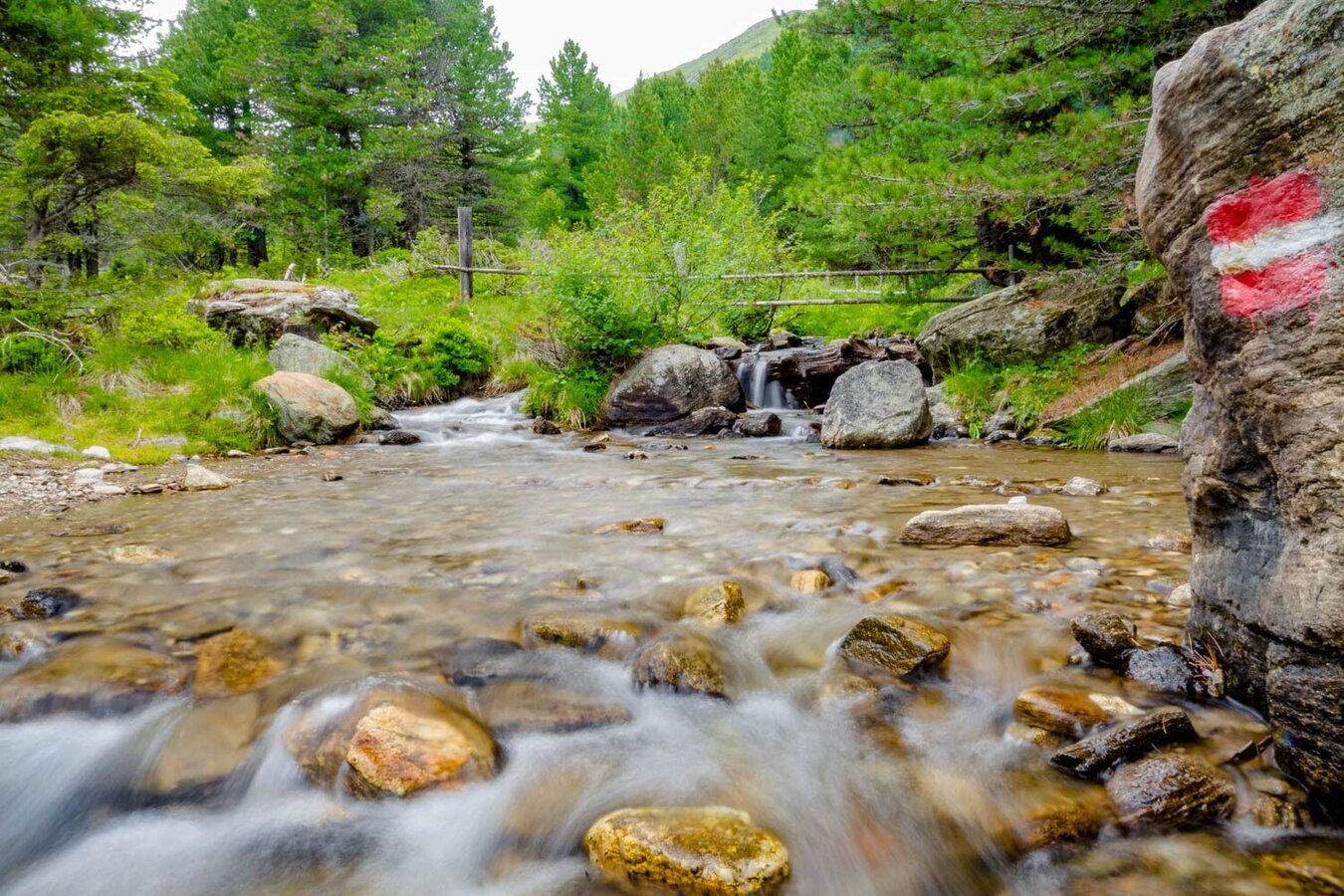 Il nostro sentiero 321 ci porta comodamente in salita, passando per la "Maria in der Zirbe" e la "Türkenkreuz", fino al sentiero 44, che ci conduce splendidamente attraverso il bosco di pini cembri alla Stoanahütte.