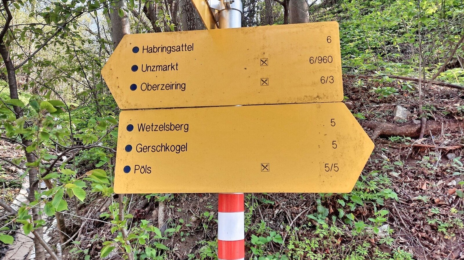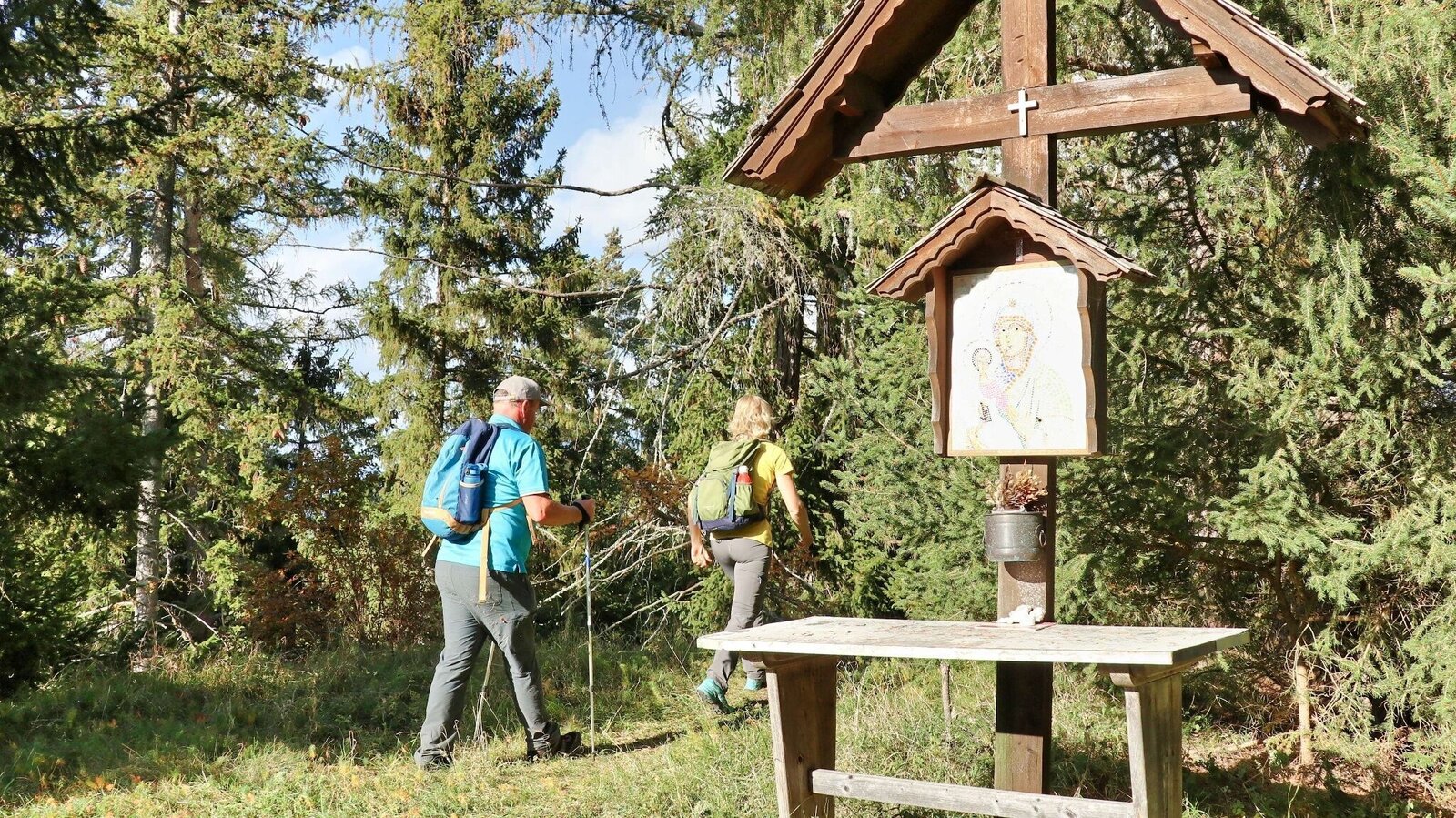 We start at the village square of St. Georgen ob Judenburg (1), 734 m, and walk slightly downhill through the village. After crossing the Mur bridge and the railway tracks, we see the yellow signposts and the road sign for Wetzelsberg at the crossroads. We keep right uphill and follow the tarmac road through Pichlhofen. Staying on the road, after approx. 2 km we come to the few houses of Wetzelsberg (2), 950 metres. At the crossroads with the "Wetzelsberg" sign, turn right and follow the road. We take a leisurely and scenic walk uphill and at the crossroads keep to the signposts for Wetzelsberg no. 56, 80. The forest road, which we follow continuously, runs uphill through the forest and across large meadows until we see the yellow signposts for Gerschkogel at a crossroads. From here, the path climbs somewhat more steeply through the forest. On the Gerschkogel (3), 1231 m, there is a wooden summit cross with a colourful mosaic of the Virgin Mary. If we go down a few metres and then turn left, we have a clear view towards Judenburg. The way back is via the ascent route.