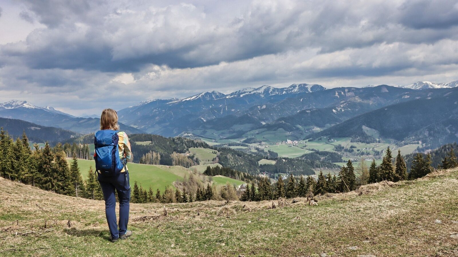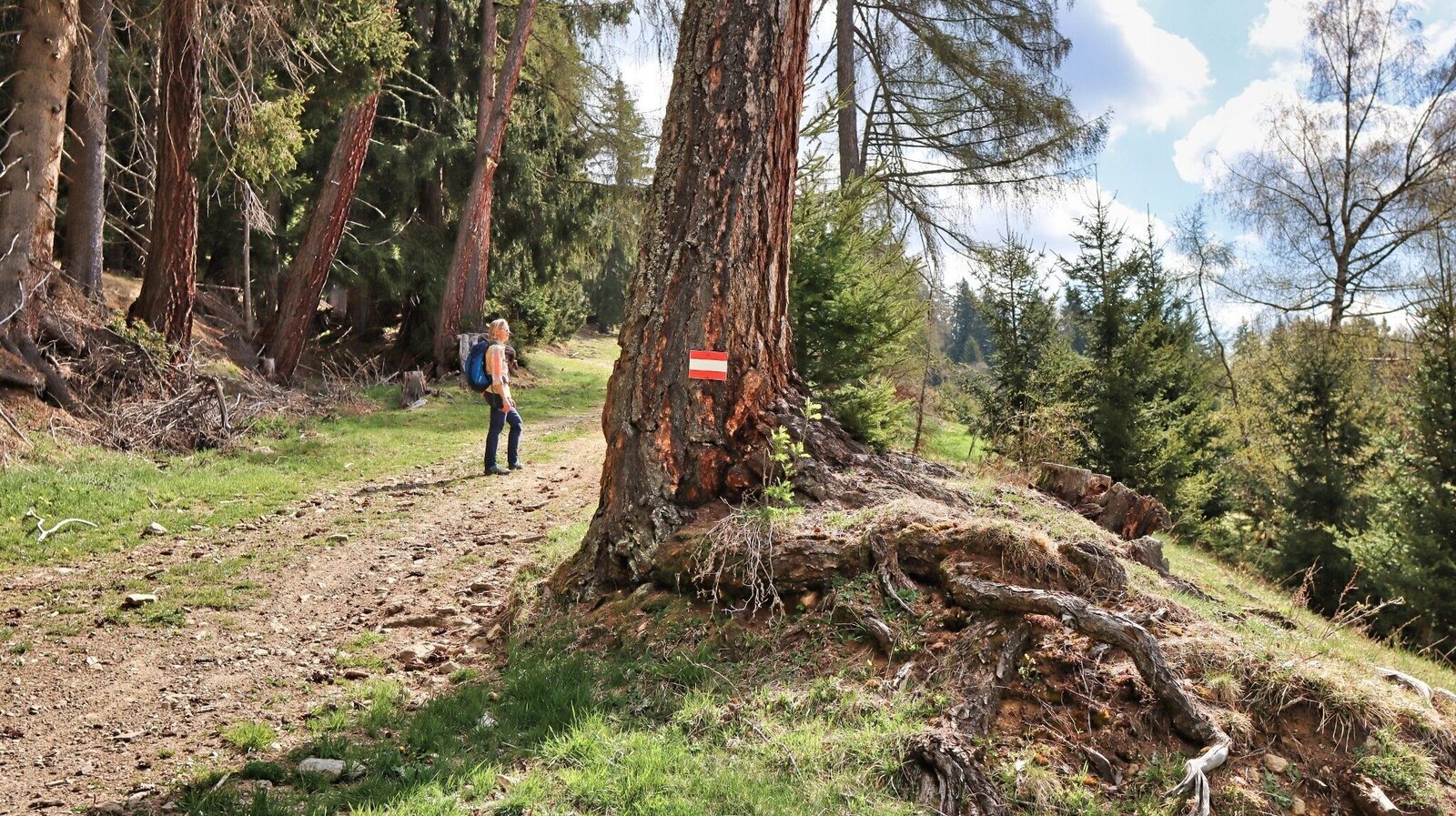 Due to a barbed wire fence, we recommend taking the detour to St. Oswald-Blick via the Habringsattel waypoint and then right along the forest road to the open areas with the magnificent view to St. Oswald. A few metres from the Habringsattel, you can see the start of the path to the summit. The path leads somewhat more steeply uphill through the forest until we reach our destination, the Habring (4), 1497 m, just before the summit area. The way back is via the ascent route.
