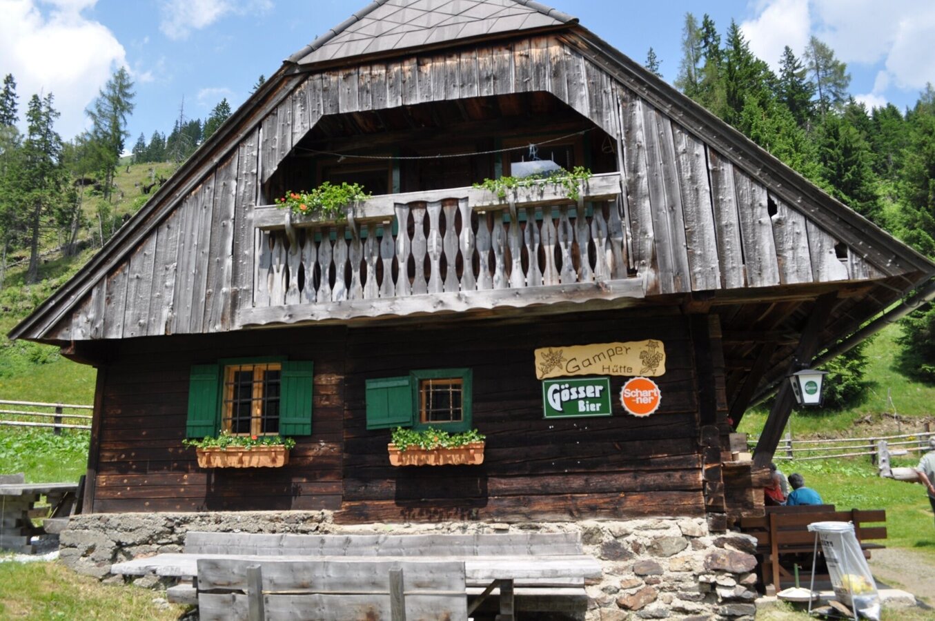 After the summit, follow the path in a south-easterly direction, which leads slightly below a ridge to the descent path. This now meanders downhill close to the Bretsteinbach stream. We walk the last ten minutes or so to the Schwabergeralm on a partly grassy forest path. After just under five hours, we are back at the starting point, the Gamperhütte.