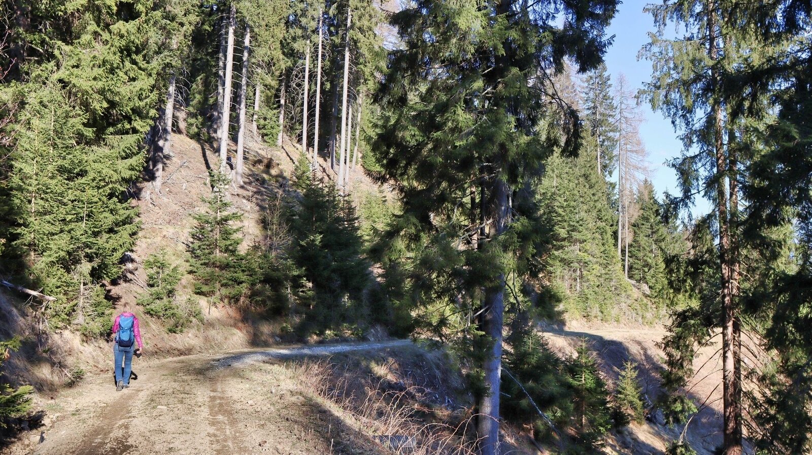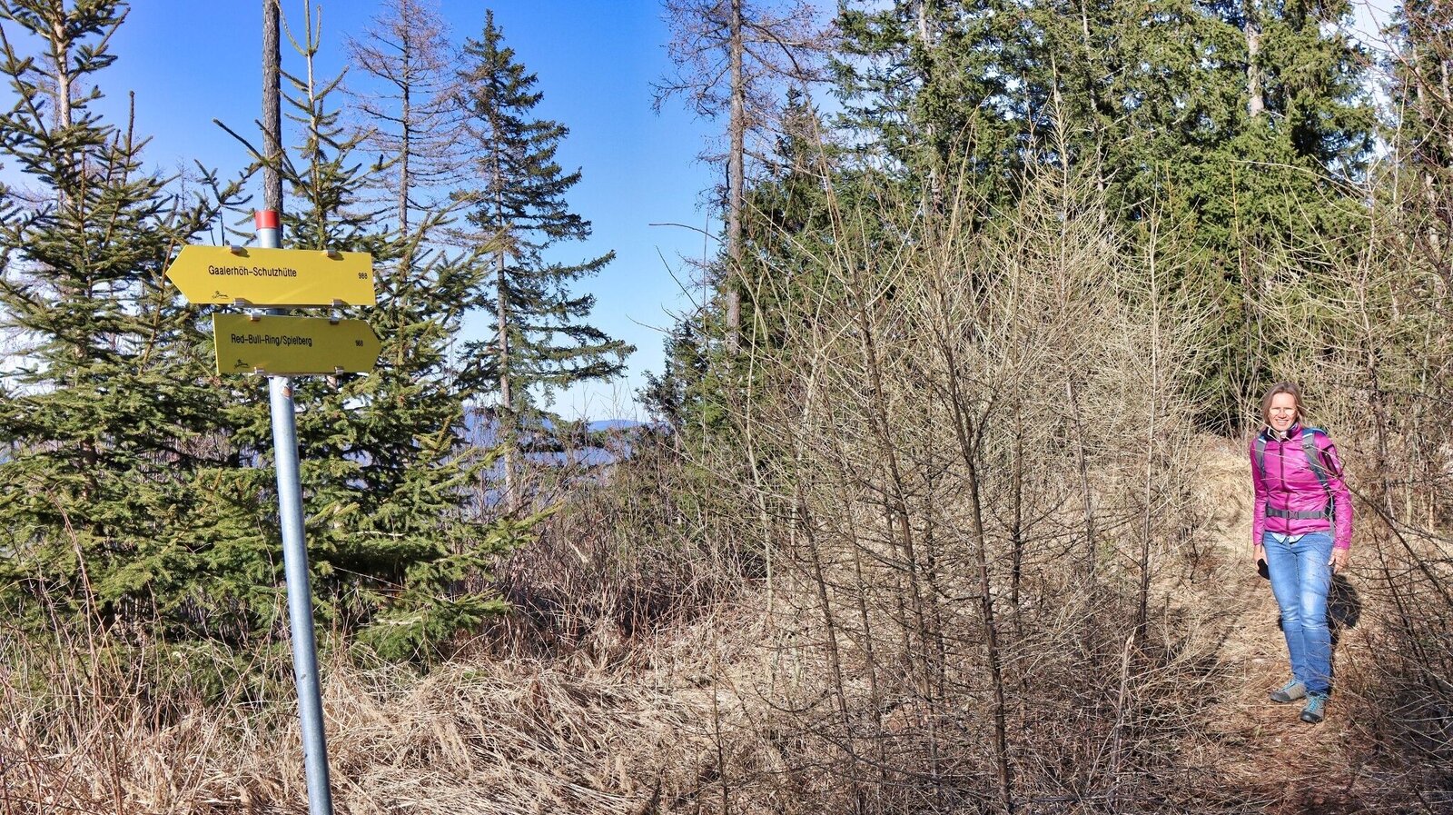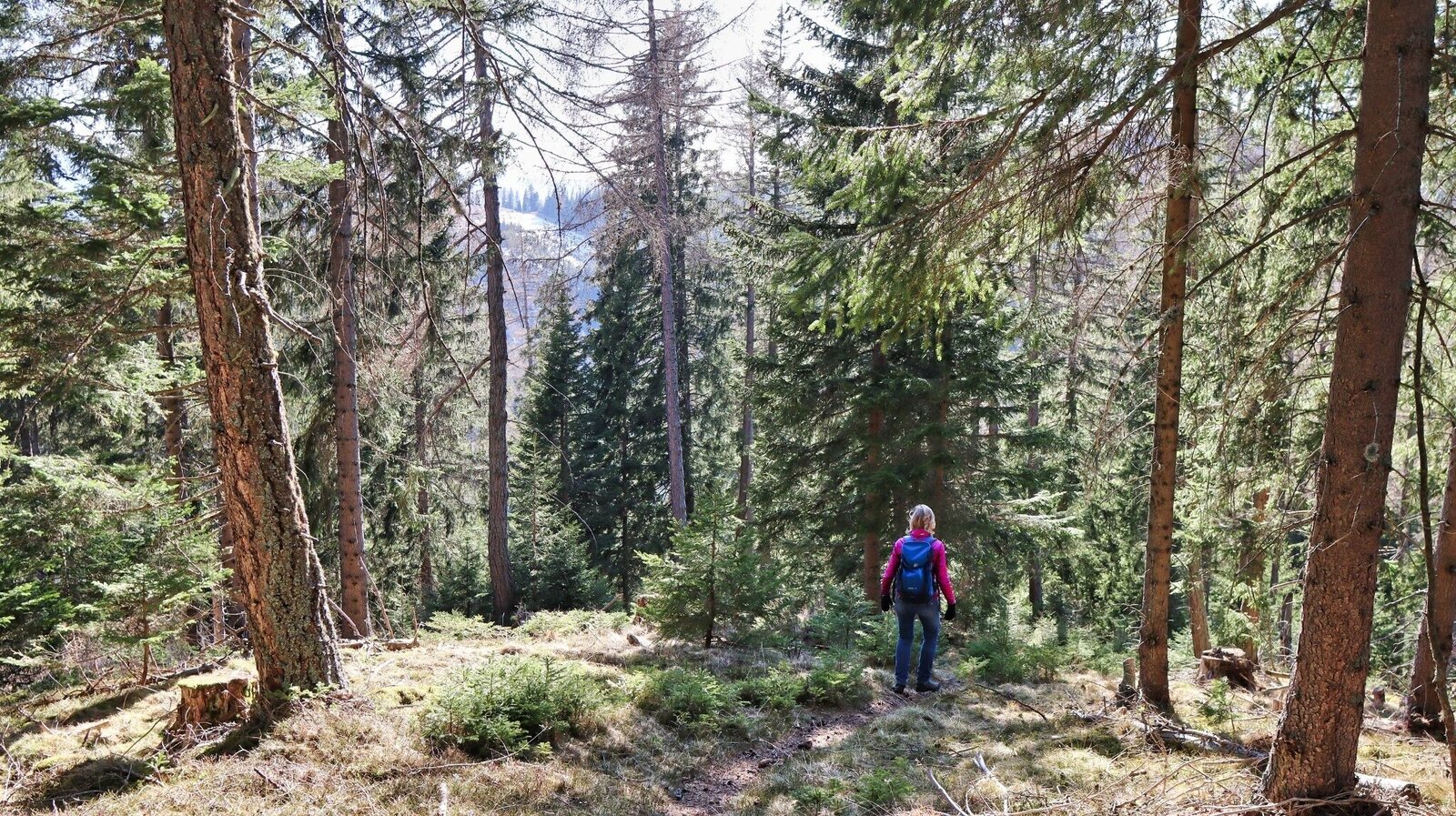 From the Gasthof Hotel Perschler (1), 702 m, we walk through the village of Rattenberg, following the asphalt road that runs slightly uphill to the right of the stream. After approx. 1.3 km we come to a forest road junction and a larger turning area, which is also used for parking. We continue uphill along the ditch until we see the entrance (2), 1012 m, to the hiking trail on the right at the start of a sharp left-hand bend. From here, we leave the wide forest road to continue along the old path. Even if this section of the trail seems a little "wild" at times, as the path is not cut out regularly, it is a beautiful natural experience to hike uphill right next to the stream bed. After approx. 1.4 km we reach the exit (3), 1117 m, of this old path and continue uphill on the wide forest road until we reach a gate (4), 1228 m. For cyclists, the tour ends here, but we pass the gate on the right and follow the road, which winds uphill in serpentines. Although we repeatedly pass junctions, we follow the marked main path until we reach a saddle or crossroads at 1422 m above sea level. From here, we are on the main hiking trail (trail no. 998), which leads across the entire ridge in a west-east direction. We keep to the right and see the start of the marked path. The path climbs a little steeper for a short while and then flattens out along the ridge. After walking downhill for a while, we come to a fence and an overpass and now reach our destination, the clearing or pasture area Auf der Höh' (5), 1464 m. The way back is via the ascent route.