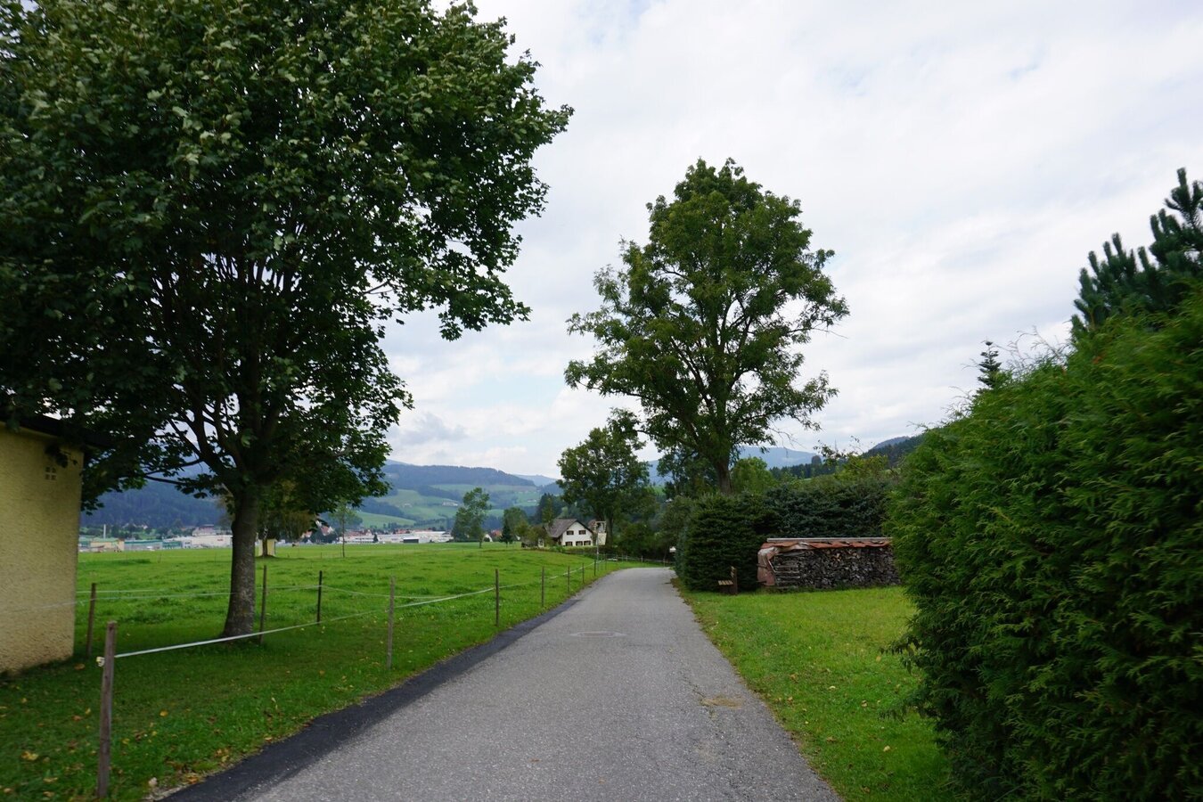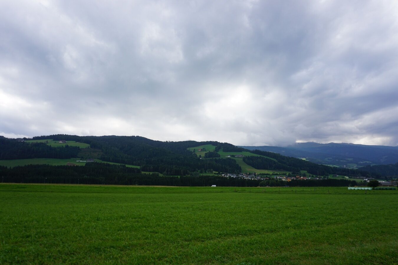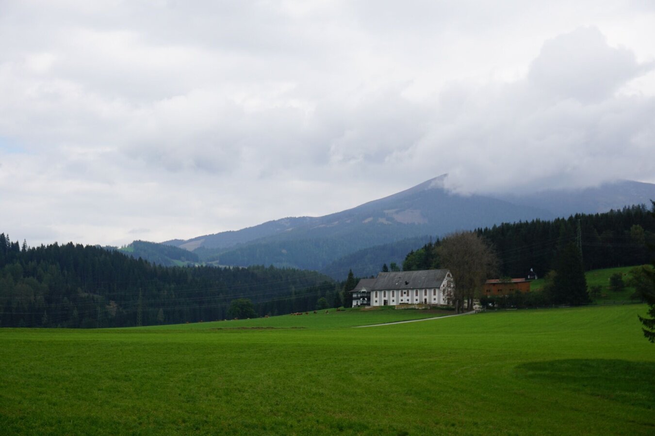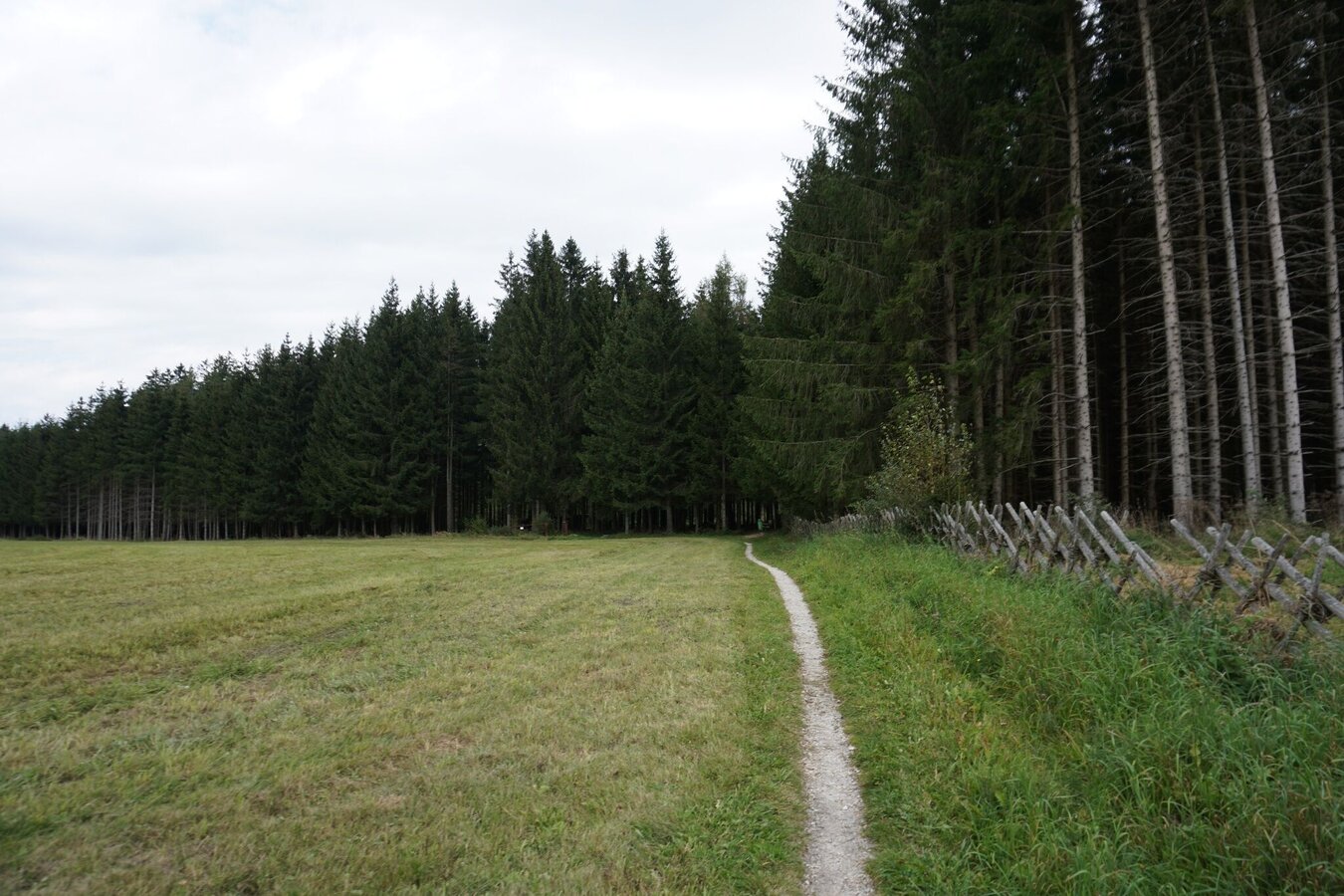 At cycle junction 96, we turn left onto country road 540. Change sides of the road at Obdacher Sattel and keep left. Follow the road into Kleinprethal until you reach a narrow field path on the left. The field path briefly runs alongside the forest and crosses a meadow with a fence.
