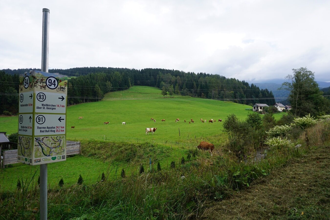 At cycle junction 96, we turn left onto country road 540. A little caution is now required here, as the main road has to be crossed. We quickly change sides of the road at Obdacher Sattel and keep left until we can turn off onto the road towards Kleinprethal.