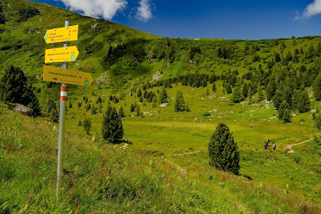 On trail 308/315 you head towards Winterleitenhütte and from there you also head to the first peak. Trail 315A leads you to the top of the Kreiskogel, from there it continues to the Scharfen Eck. From Scharfen Eck you continue to the highest of the three mountains the Zirbitzkogel (2396m).