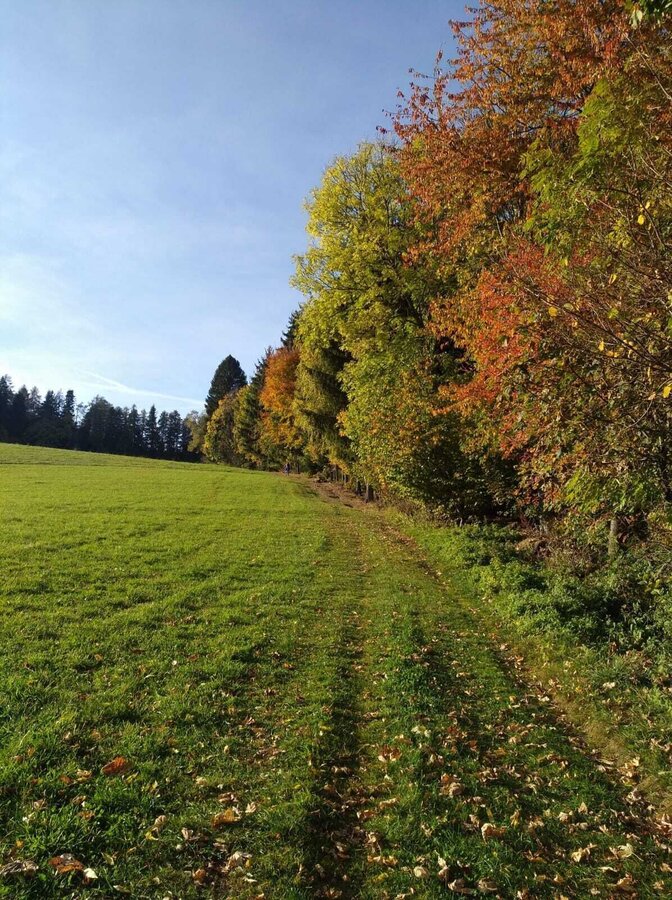 - Shortly before a pasture - to avoid it - we turn left and have a short steeper forest section ahead of us until we reach the asphalt road.