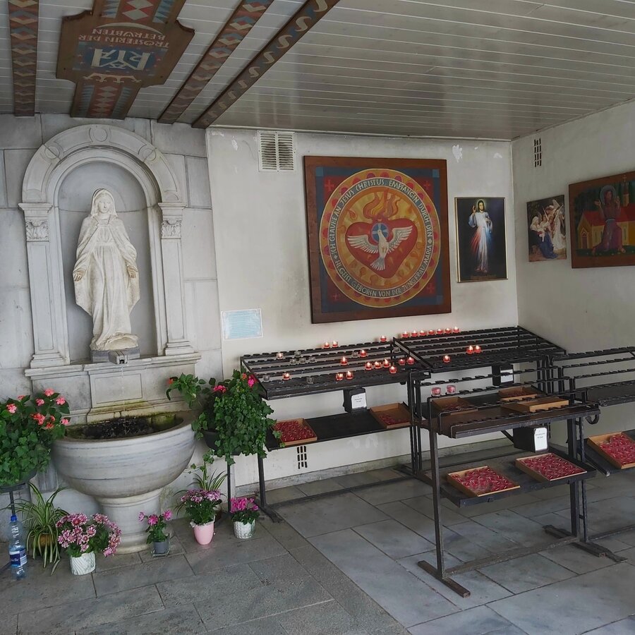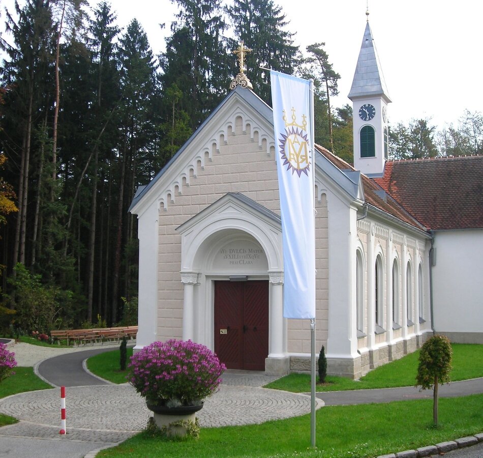 This chapel of grace, "Maria im Elend", corresponds to the present-day sanctuary. A smaller chapel, "Maria Fieberbründl", was also built, but was replaced by the prayer hall in 1894. In 1954 the prayer hall was connected to the chapel by a transept.
