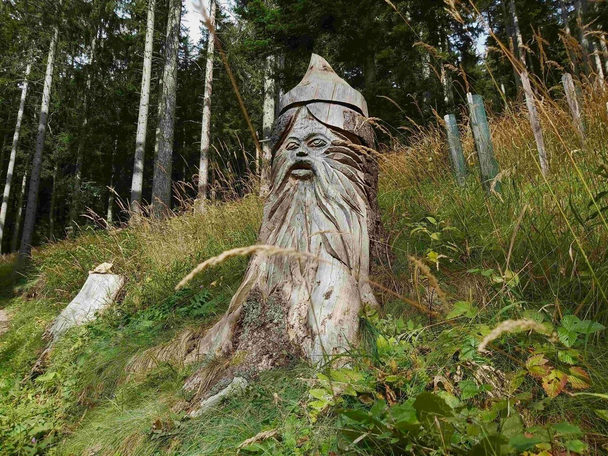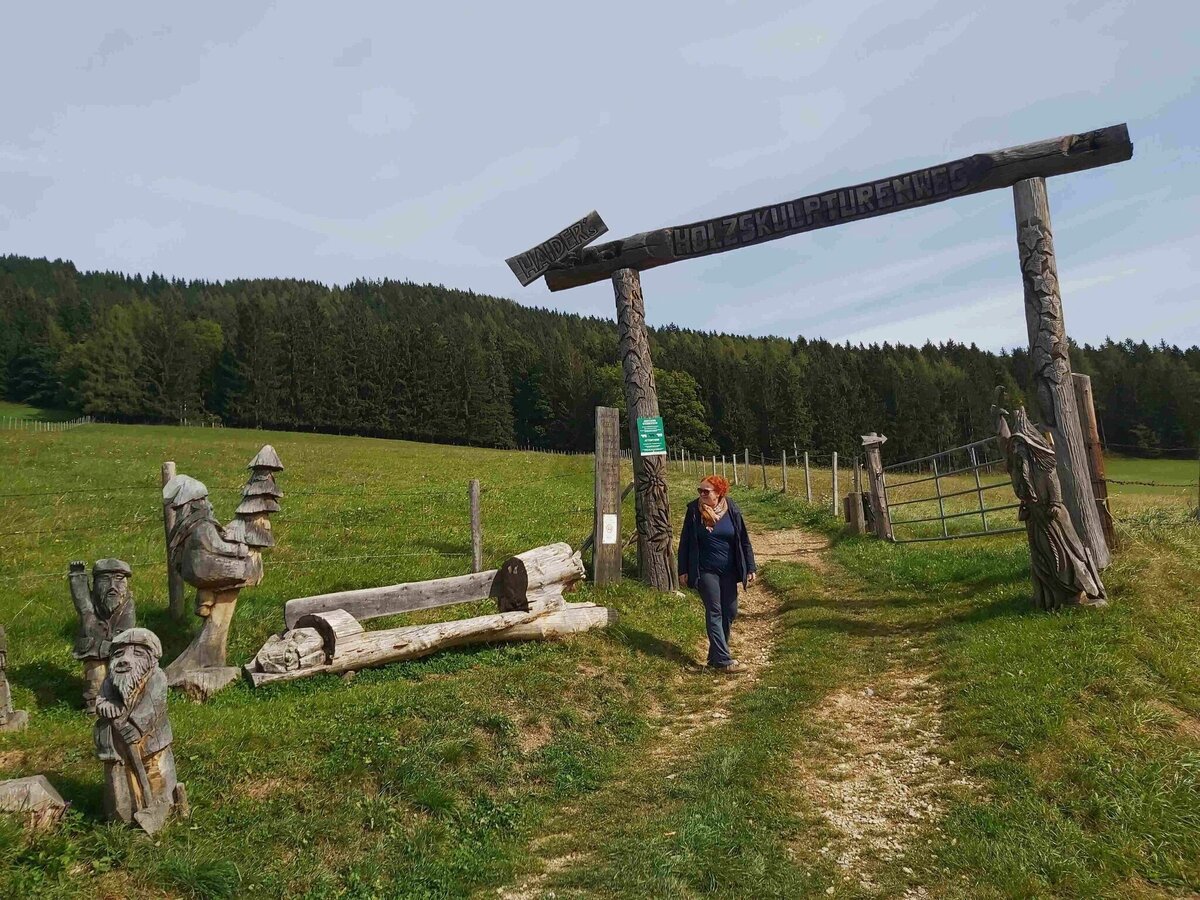 - The wooden sculpture trail ends at a culvert on the forest road, directly below the Gschaid-Nock or Gschaid-Berg.