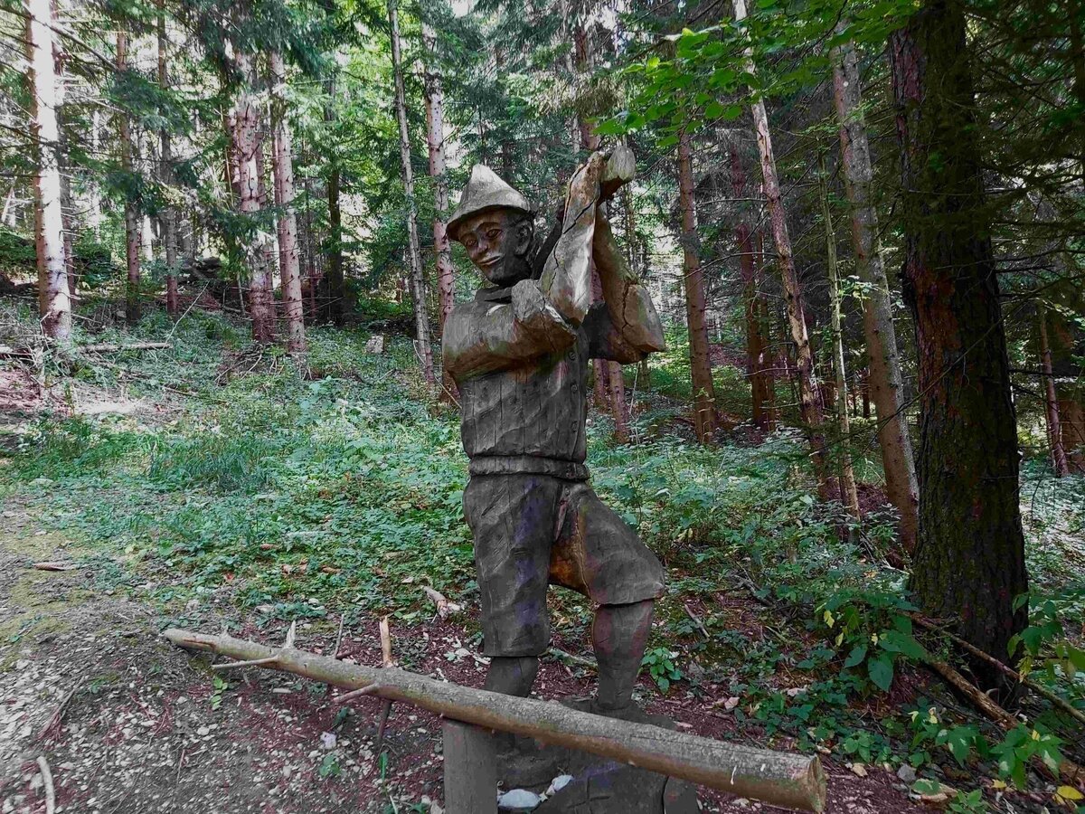 - We climb the first 1.5 kilometres along the themed trail with wooden figures and information boards.