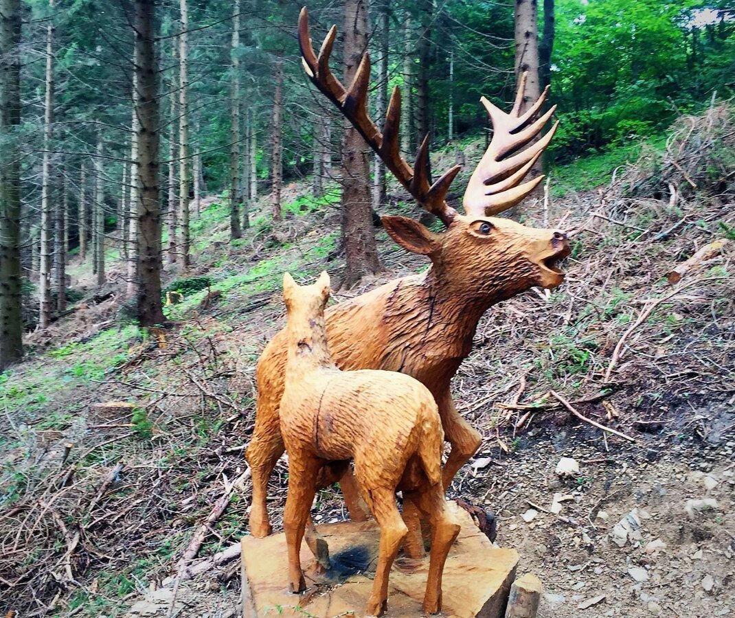Woodcarving with a chainsaw is the hobby of Erich Haider-Harrer, who is also an innkeeper and farmer on the Nechnitz, the high plateau in the municipality of Fladnitz an der Teichalm. With his wooden figures, mainly native forest animals, he has now created a wonderful path from the Nechnitz up almost to the Gschaid Nock summit.