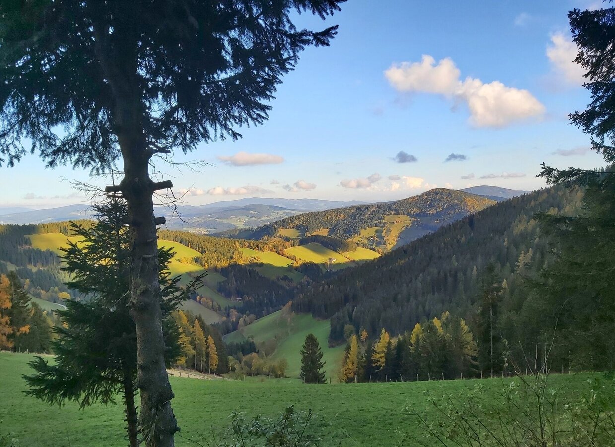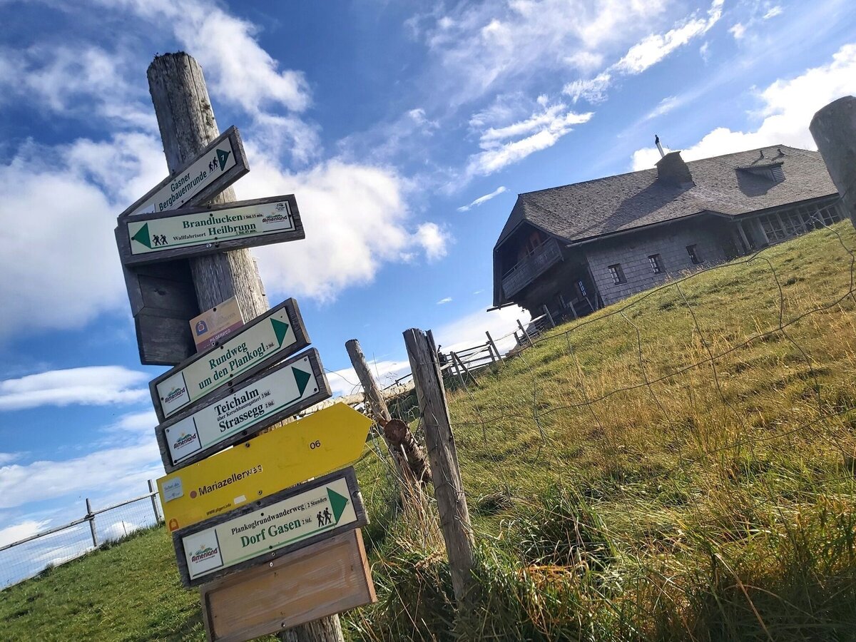 The hike leads from the Musidorf Gasen over the Pöllabauerkreuz to the Haberstall Hut and on to the Sommeralm. The climb to Plankogel with its impressive summit cross is rewarded with breathtaking views. You cross idyllic pastures and picturesque forest sections that offer cool shade, especially in summer. The route is not only characterized by its viewpoints such as the Stoani World Tower, the rustic Haberlstall Hut or the "Pöllabauer Pless", but also gives an insight into the diversity of the landscape. The descent leads to the Stoakoglhütte before the circular route leads back to Gasen.