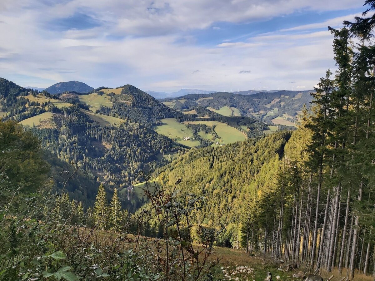 - On the way we pass the “Pöllabauer Pless” (crossroads). Here we get a beautiful view over Mitterbach & Gasen