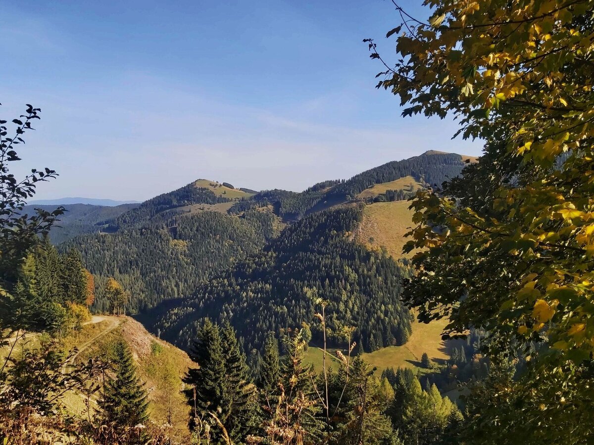 - Before the next gate we turn left up into the forest. To the right we see the Hochlantsch, up to the left in the forest is the Mitterbachkogel, which we bypass.