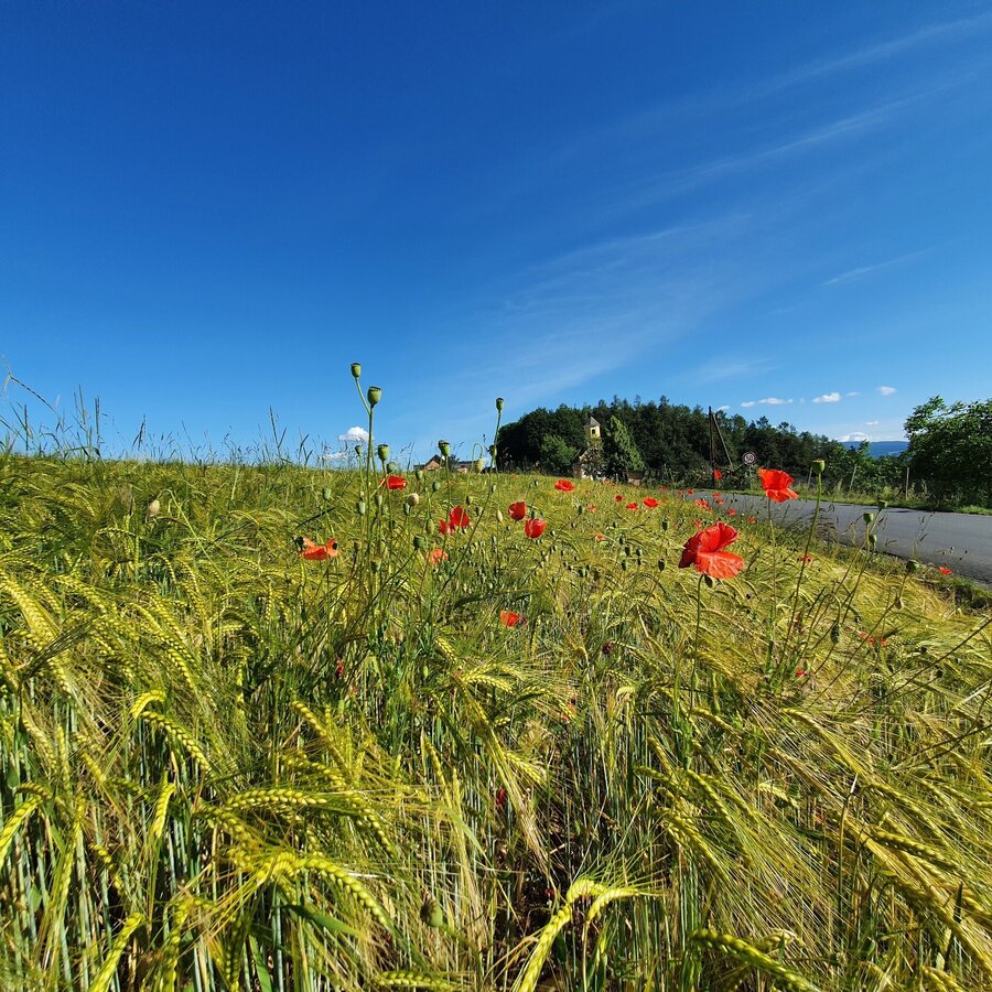 - After a short, slightly steeper climb in the direction of Etzersdorf, Heimschuh, we reach a beautiful ridge with views towards Kulm and eastern Styria.
