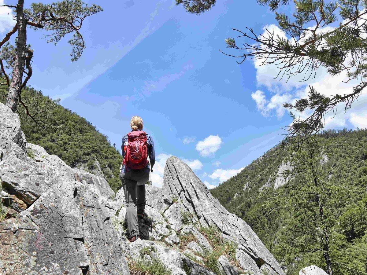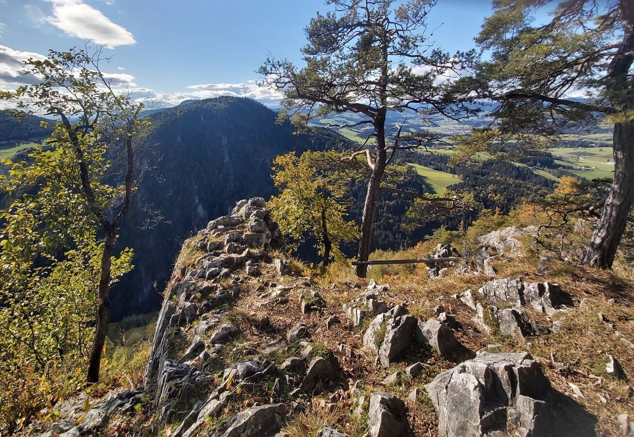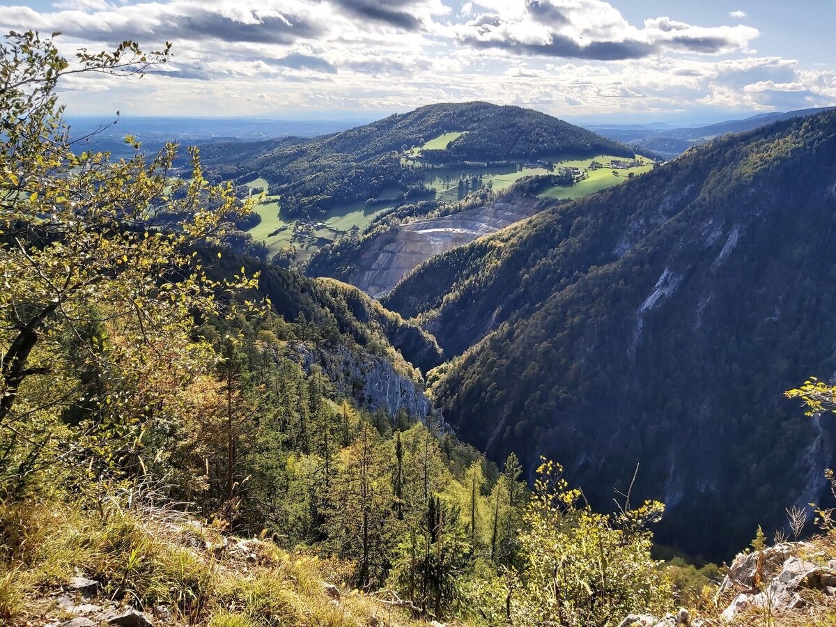 - We now head out onto the Patscha-Nase, past a rest area to the magnificent viewpoints above the Weizklamm gorge: in front of us the Wolfsattel with quarry, behind it the Schöckl and then the Passailer Kessel with the Rote Wand in the background. Please be careful here, it is a steep descent and there is no protection!
