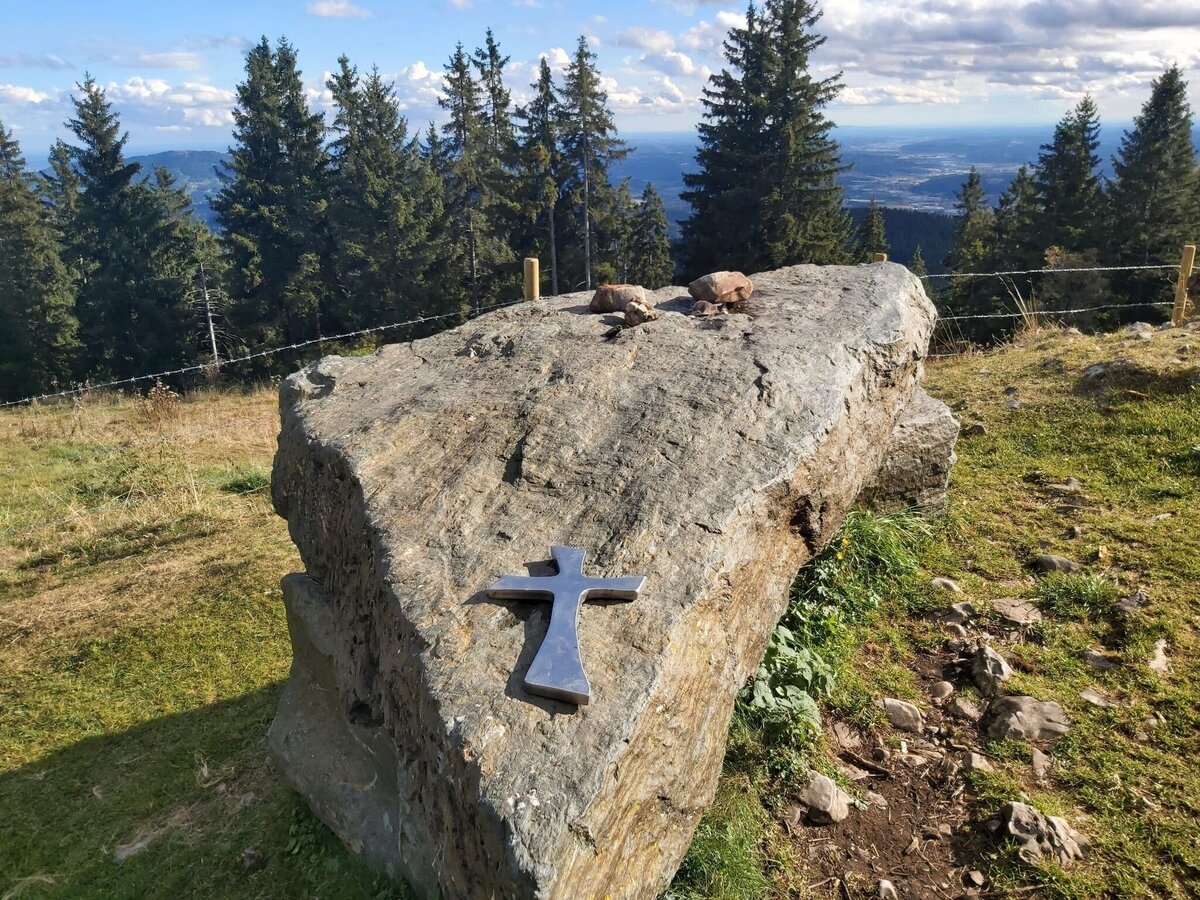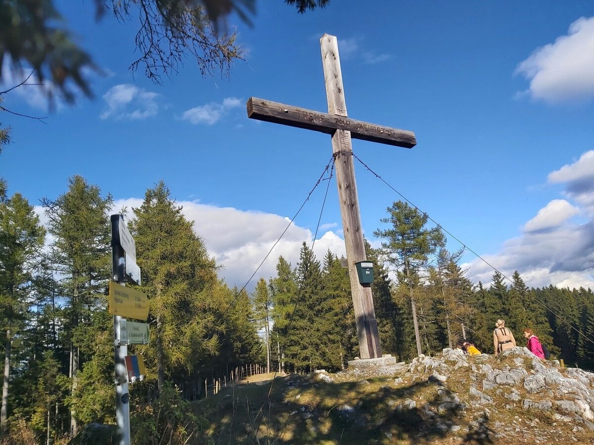- The Patscha summit cross is located on a high plateau with pasture, to the right in front of us we see the Zetz, to the right below is Weiz. The rock with the cross serves as an altar during mountain masses up here.