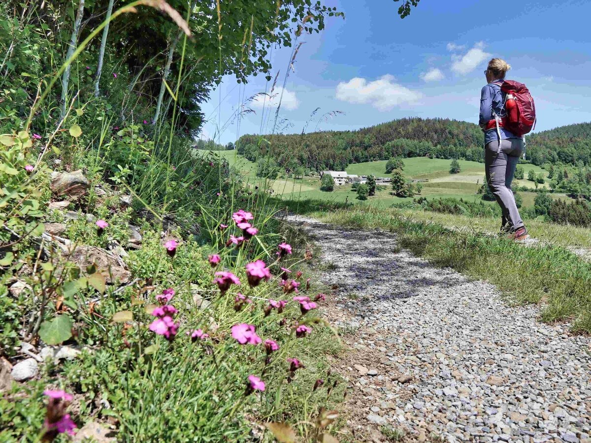 - Two hairpin bends further on, the asphalt road turns into a gravel road. From here, the route continues along field and forest paths.