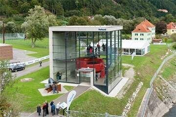 Am Weg liegt die Schauturbine des Verbunds, die durch den gläsernen Verbau auch von außen gut besichtigt werden kann.