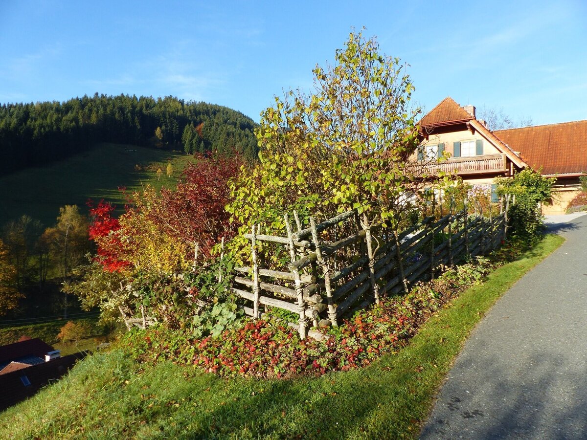 - Along panorama trail no. 14 to the asphalt road to the "Willingsbauer", now a few metres on the asphalt road, then already off to the right again and through high forest up to the "Großauer" farmstead.