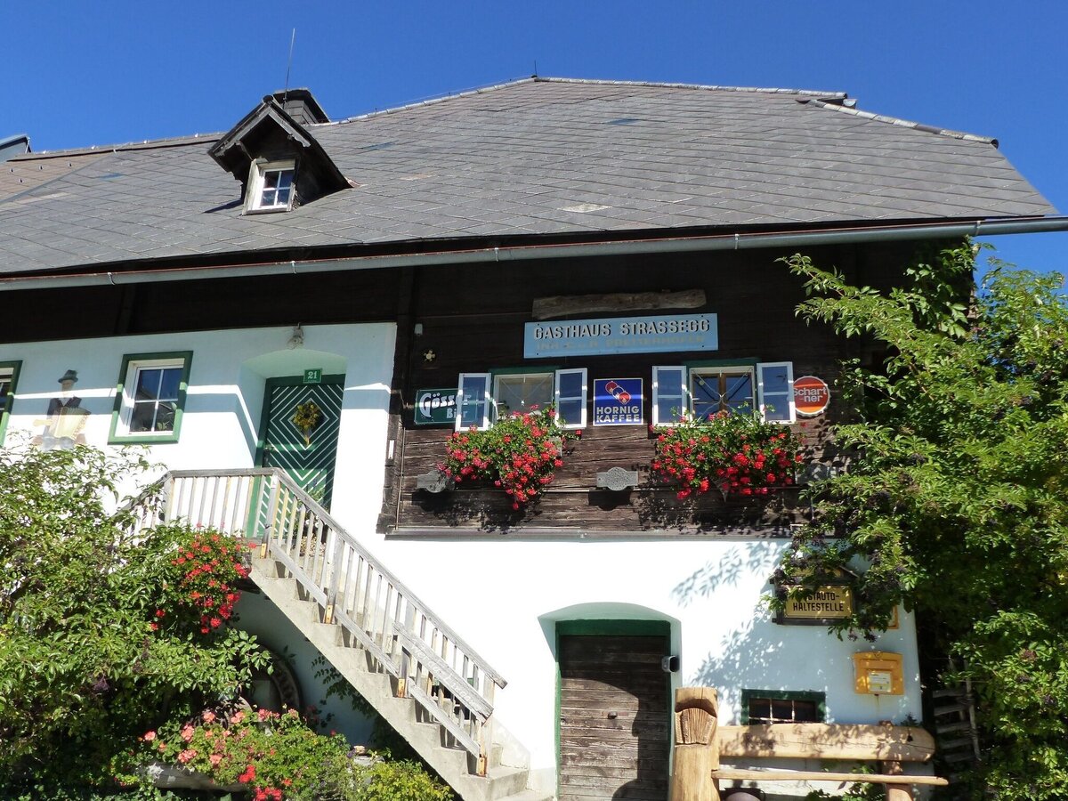 - The trail now leads to the left and you hike comfortably, alternating through high forest and past lush alpine pastures, over to the "Stroßeggwirt" inn.