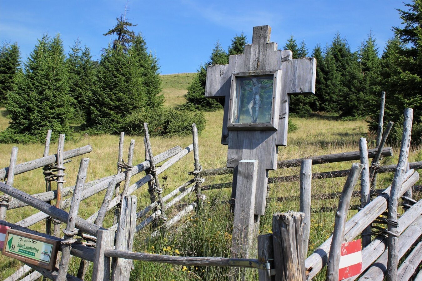 - Through an opening in the protective fence (marked red-white-red) you reach the "Weizbachquelle" spring and continue downhill to the "Stoakoglhütte".