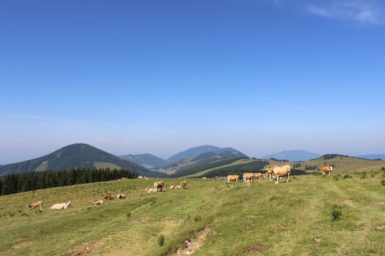 - Continue in the direction of Mitterbachkogel (trail no. 730/706, Mariazellerweg). The trail flattens out again out of the forest and down to the Pöllabauersattel.