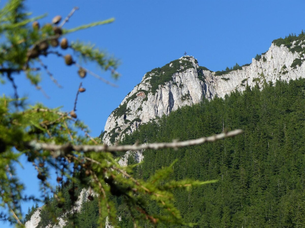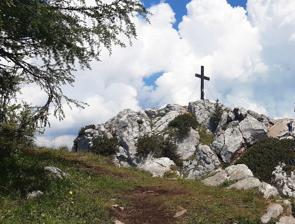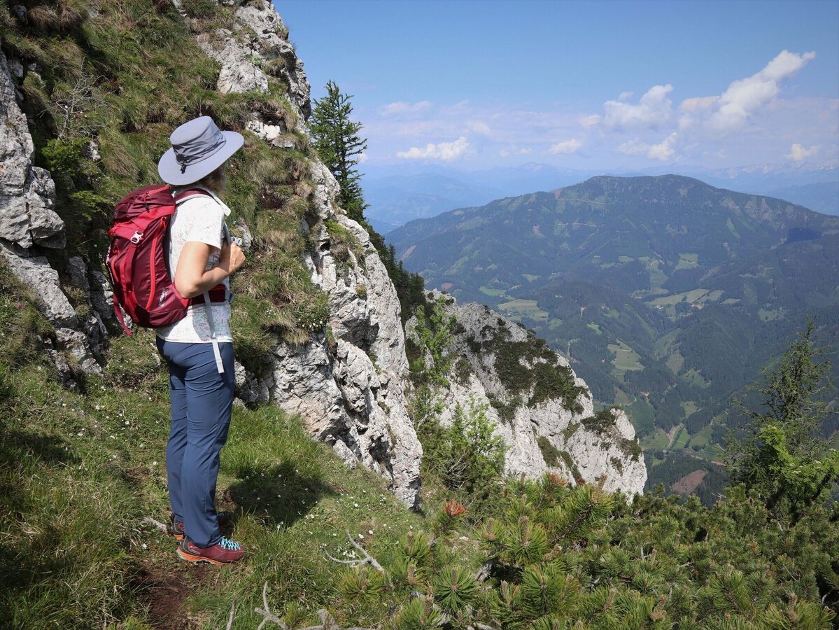 - Still on “path no. 740, Hochlantsch/Teichalm” we are now climbing in high alpine terrain, partly insured, up to the summit cross. From here in the east we can see the Teichalm with the lake, the Osser and the Sattelberge, and in the north we can see the mountain range along the Breitenau.