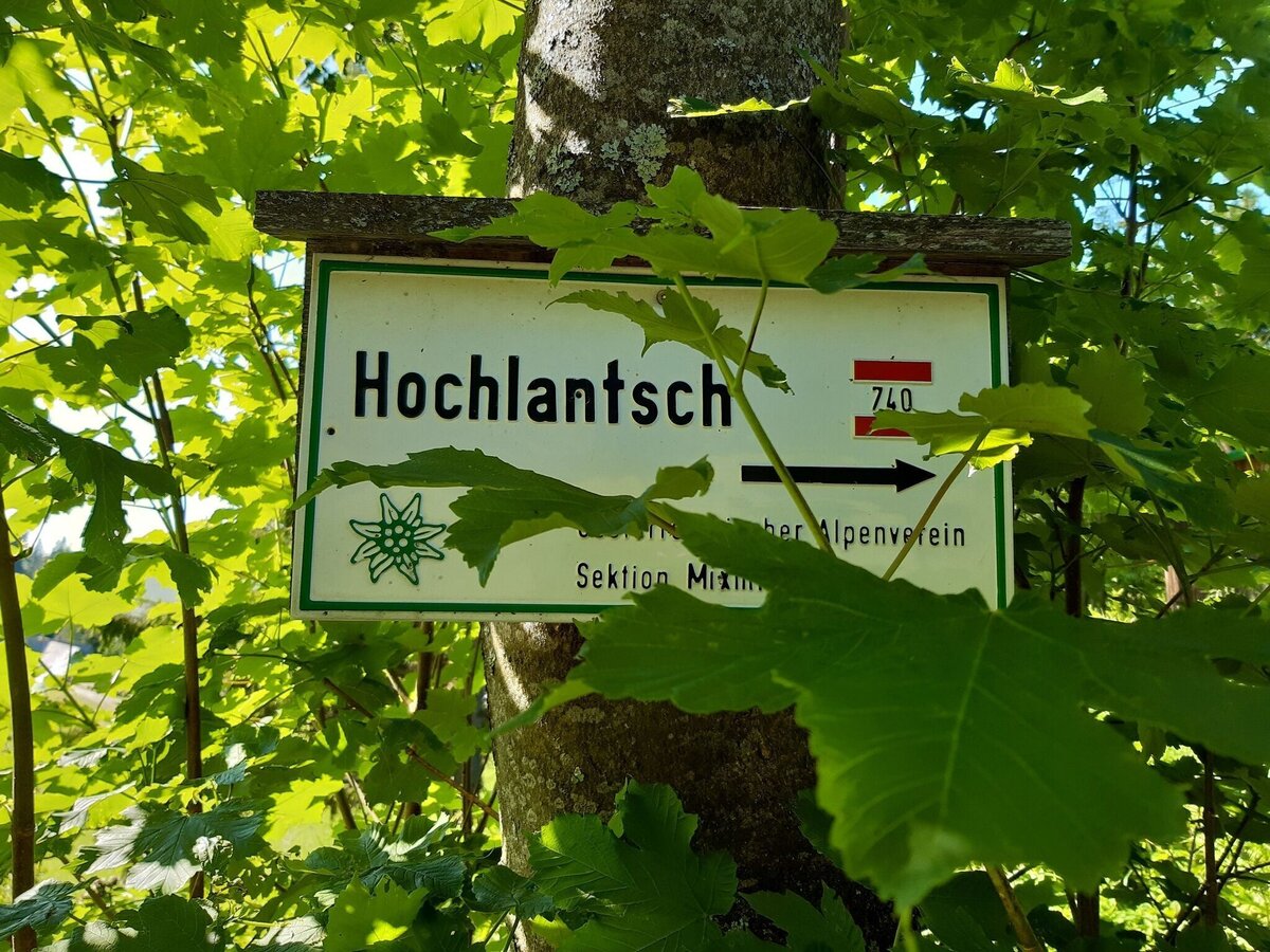 - We start directly at the parking lot, just before the farm entrance the sign shows “Schüsserlbrunn/Hochlantsch, path no. 740” to the right.