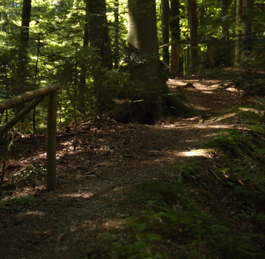 - At the end of this section of forest, we cross a small road (Dietmannsdorferstraße) and turn left into the forest after about 100 metres, directly by a house. Here we walk through a beautiful deciduous forest and over an idyllic bridge (Salmbachbrückerl).