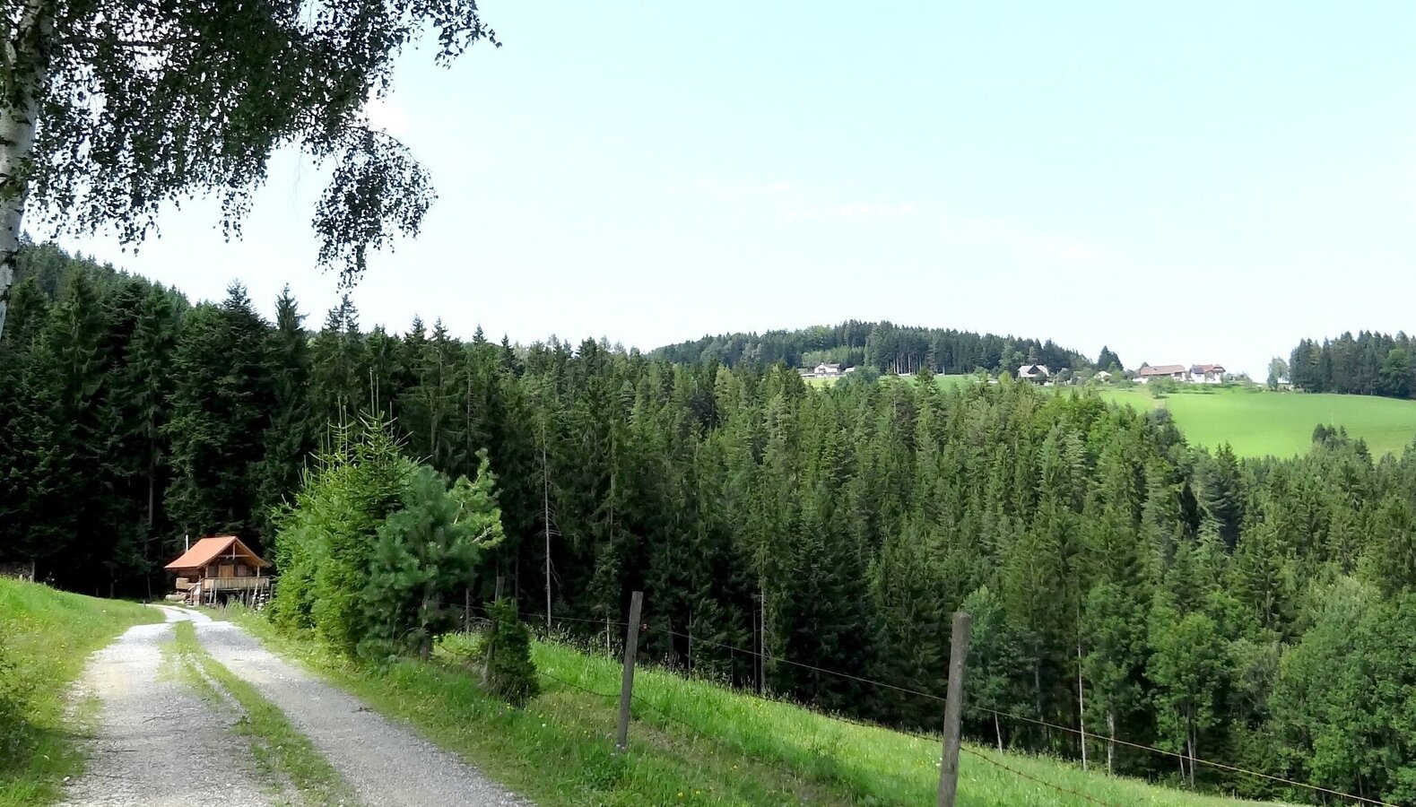- On a slight incline, we walk along the gravel road in the forest until we reach the Kern-Hütterl. Immediately before the Hütterl, a path points left uphill through the forest onto a farm track