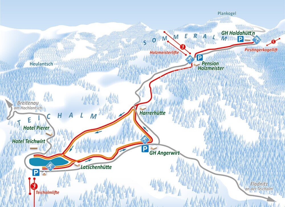 A description of all cross-country trails can be found in the winter folder of the Almenland Nature Park, which is available free of charge at all businesses and at the Almenland office in Fladnitz/Teichalm.