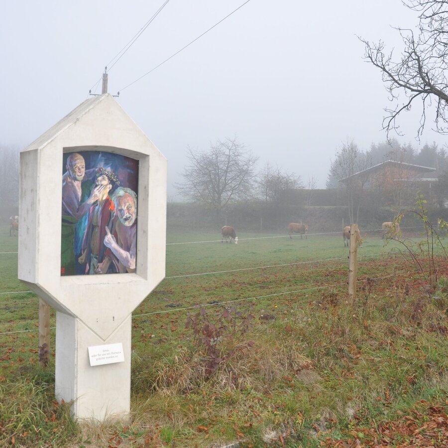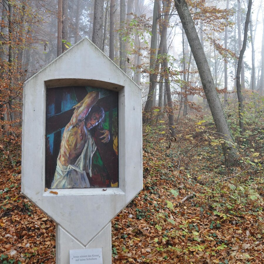 • There we can already see the first sign of the Thannhausen Way of the Cross. Keep to the right at the road junction and then turn left at the next opportunity to turn onto a gravel path.
