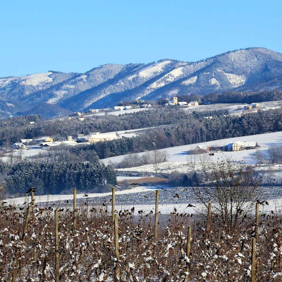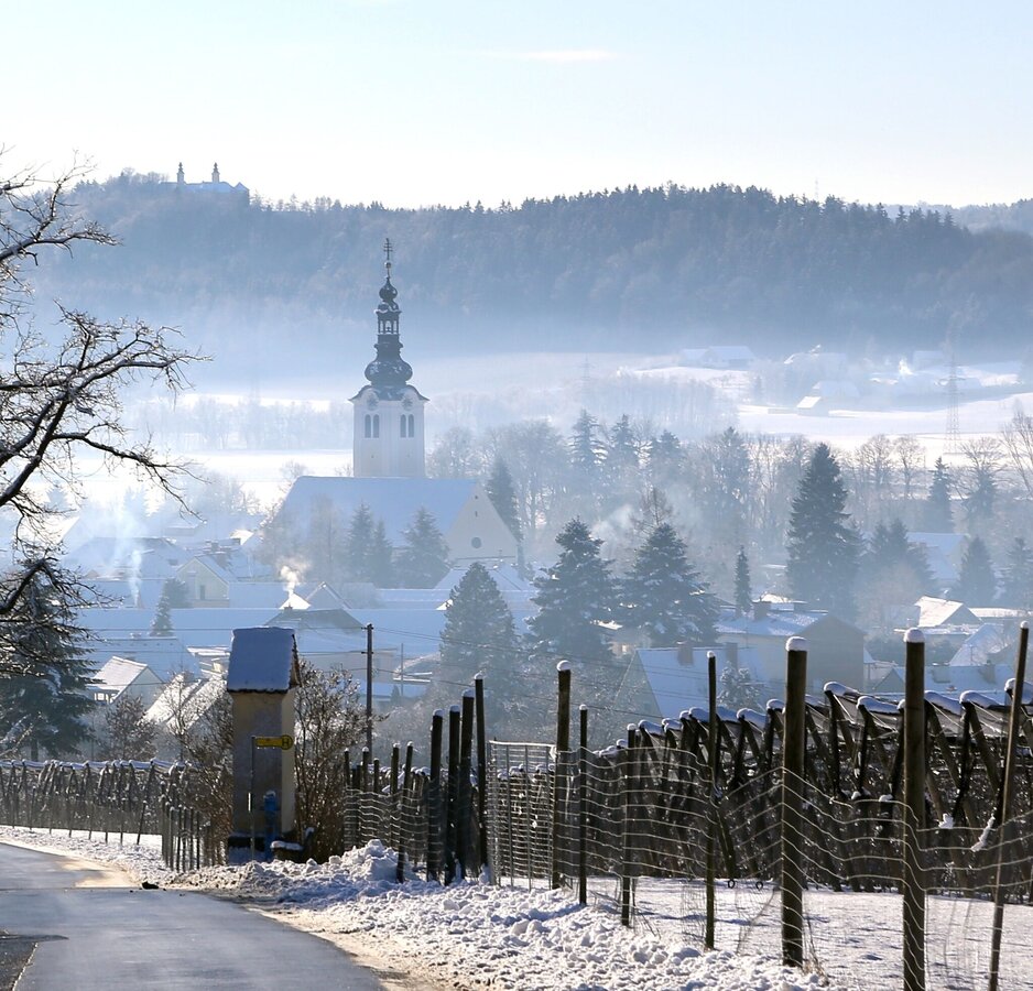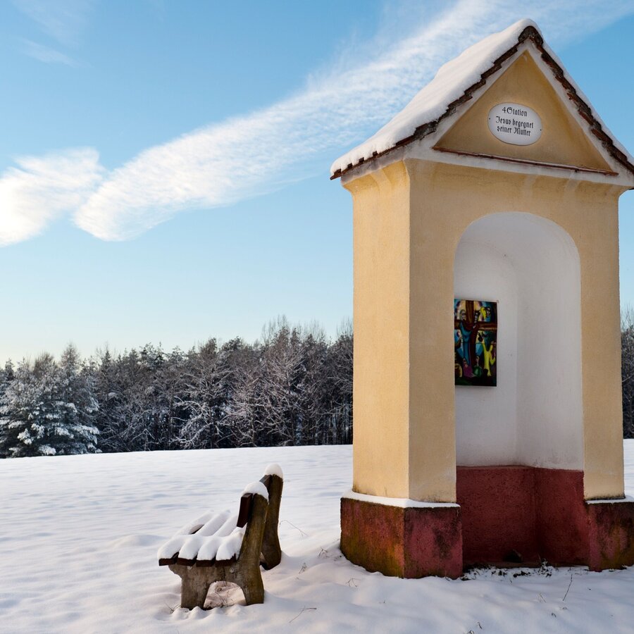 - A few metres after the Spitalkreuz, we turn half-left onto Breitegger Straße, which we now follow. The beautiful wayside shrines and enchanting views of the wintry surroundings of St. Ruprecht an der Raab, characterised by dense forests alternating with vineyards and apple orchards as well as fields, are companions on this climb to Breitegg.