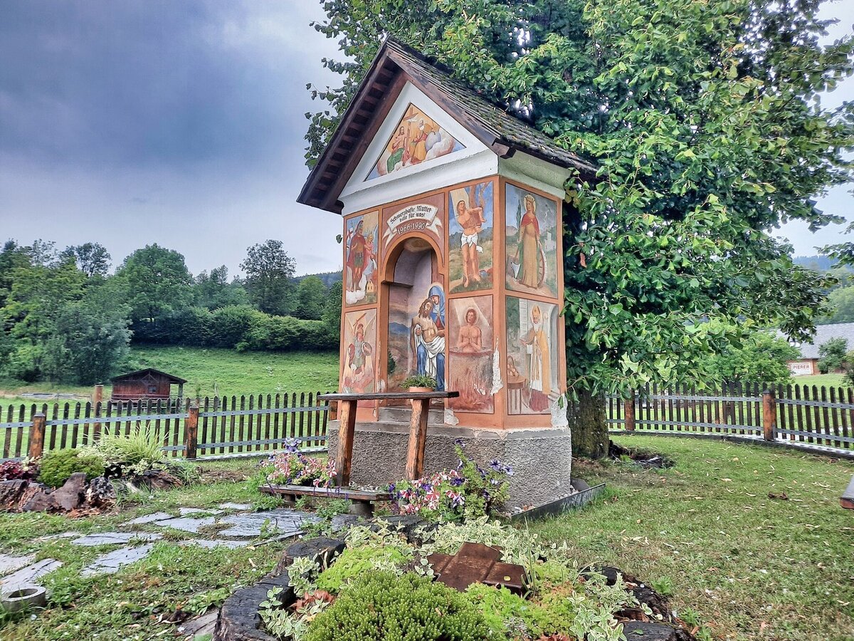 - We continue hiking steeply uphill through the forest to the open alpine pastures. The “Schwoabauer Cross” is also located here.