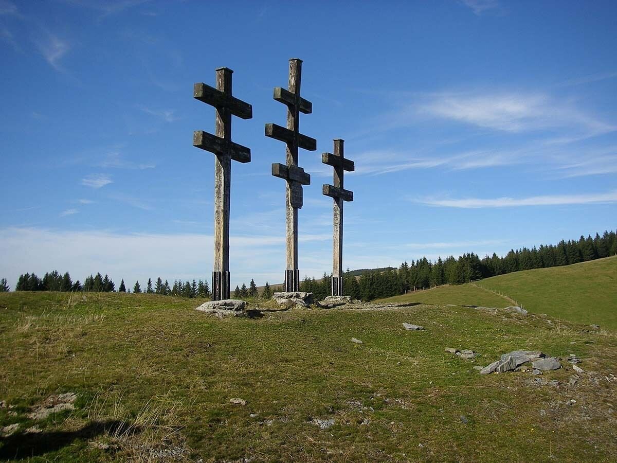 - On the hill, near a beautiful cross and some benches, we turn left into the street and pass a large Christmas tree plant.