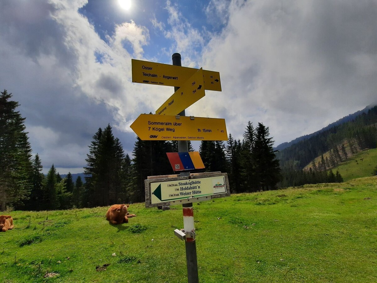 The hike starts in the middle of the town center of Passail and initially goes along an asphalt road to the "Raabursprung", at the foot of the Osser. Here you will also find the Waldmühle snack bar and a small parking lot if you want to shorten the first part by car. The path continues over the soft mountain ridges and alpine pastures to the Sommeralm and the “Siebenkögel”. The descent takes place via the Bründlkogel and the Schwarzkogel to the "Hohenauer Ochsenhalt" - where the Styrian Mariazeller long-distance hiking trail also runs. It then goes back to the town center of Passail, where you can enjoy a stop after the hike.