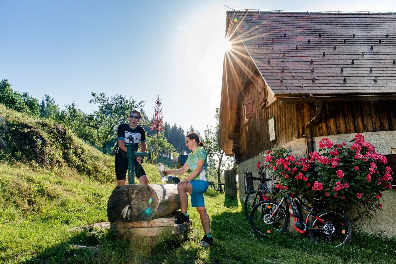 Strengthened and satisfied, you hike along trail 33 down to the source of the Mühlbach and then back to the starting point. On the path through the valley of the Mühlbachgraben is also the official MTB route, so caution is requested.