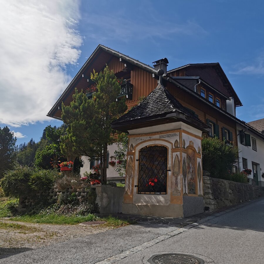 After passing through Obersdorf, the route circles the Kumitzberg with the Maria Kumitz pilgrimage church – a special cultural highlight on this Nordic walking route in the Salzkammergut. After an underpass at the federal highway, the trail runs along the Obersdorfer Moos to the “Pleam” estate. There it joins the Laasenweg (trail no. 22), which leads back to the starting point at Haus Trinkl.