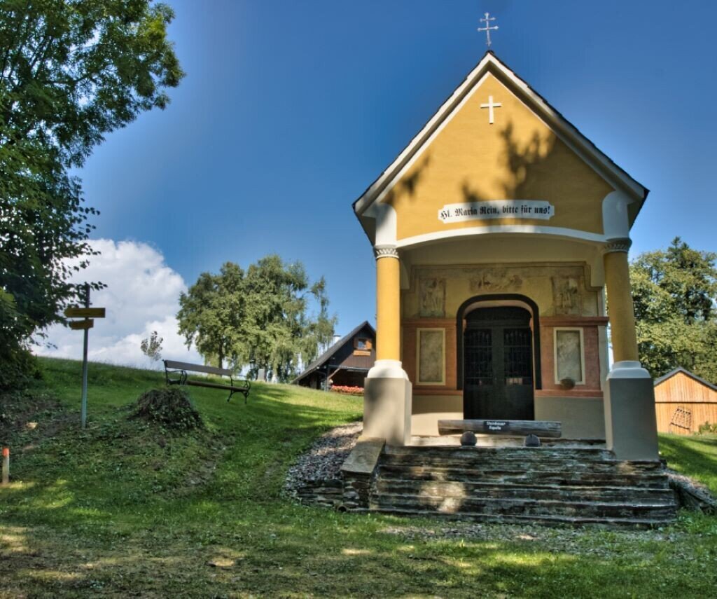 Slightly uphill you continue to the Steinbauer Chapel, where you will find a hiking trail junction. On the right, a marked trail leads over Gamsgebirg down to Stainz, on the left, trail 571 leads up to Absetzwirt.