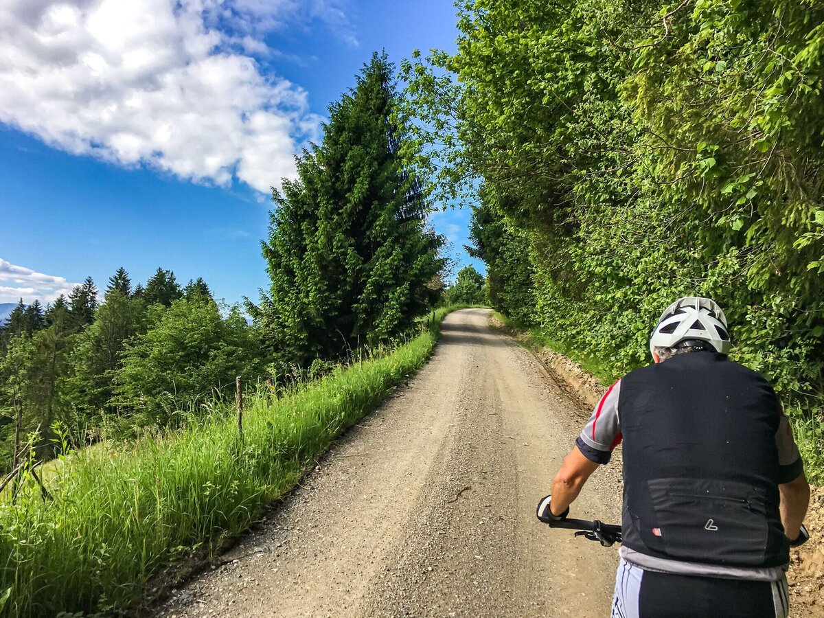 - Follow the fantastic gravel road eastwards via Sveti Janez to Remsnik and over to St. Pongratzen, always varied uphill and downhill with fantastic viewpoints down into the Slovenian Drau Valley.