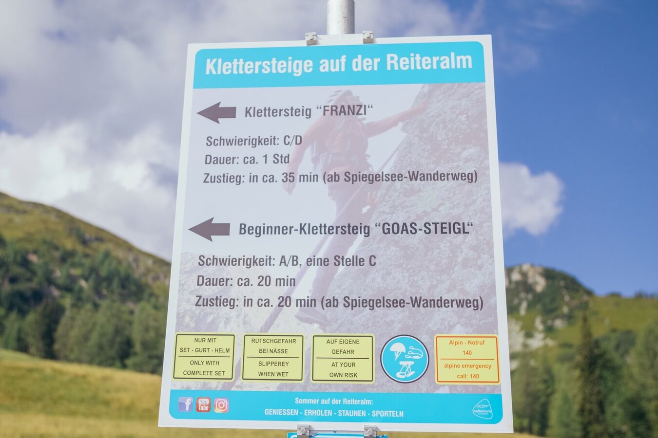 Leicht erreichbarer Kinderklettersteig auf der Reiteralm. Die Schwierigkeiten bewegen sich im Bereich A/B eine Stelle C.