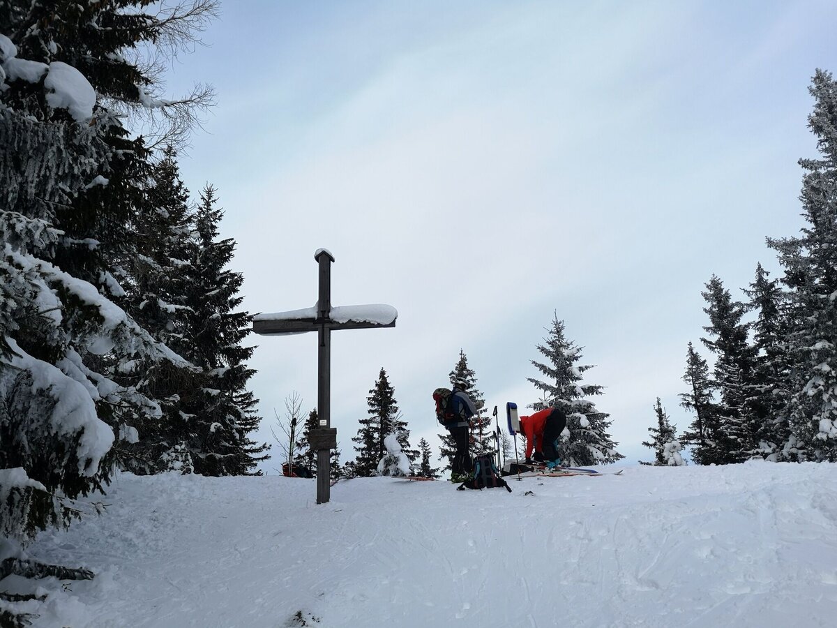 Weiter geht es zum Nikolauskreuz (hierher auch von Arzbach), einer markanten Wegkreuzung, bei der man auch Richtung Krieglach absteigen kann. Wir aber wandern weiter, teilweise durch dichten Wald, zur nicht mehr weit entfernten Malleistenalm (ebenfalls nur im Sommer bew.).
